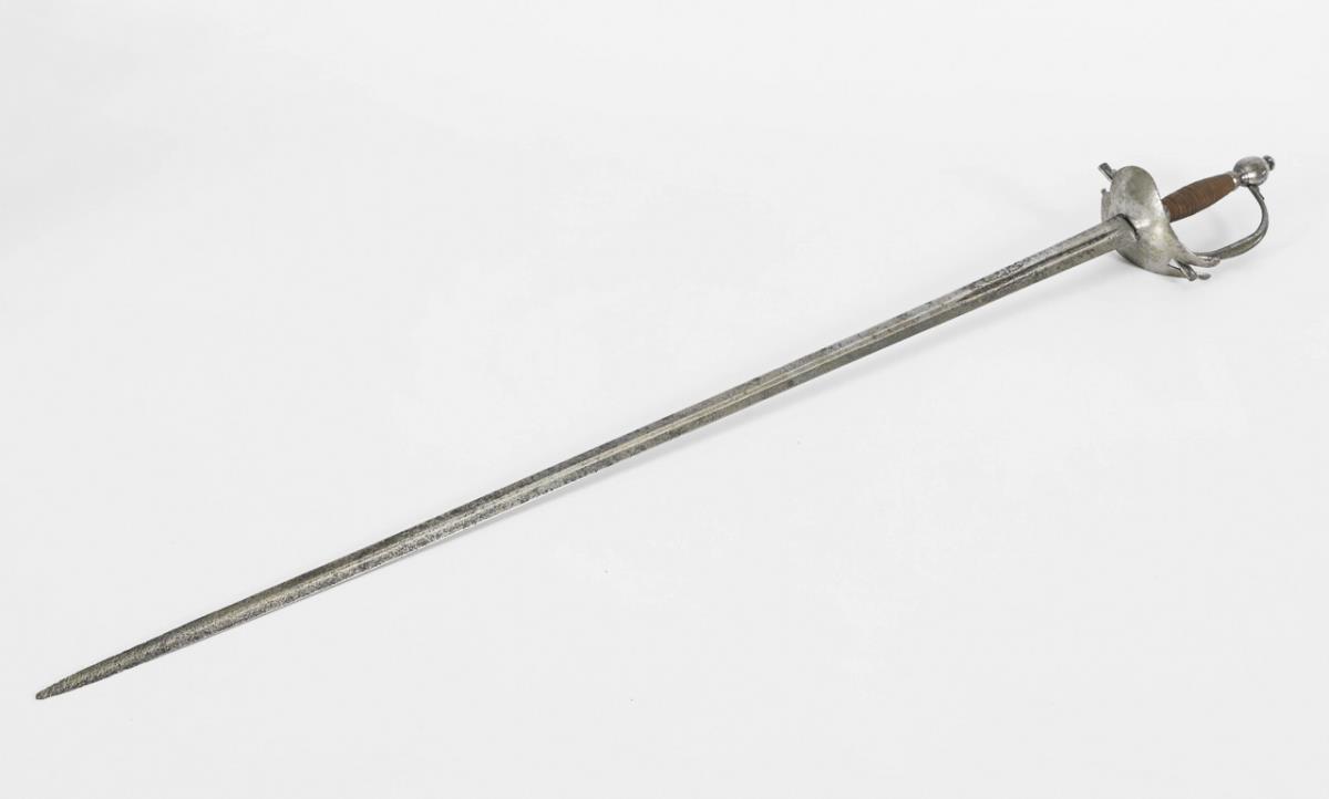 Gerade, zweischneidige Klinge, im Querschnitt sechskantig, zum Griff hin mit schmalem Hohlschliff. Beidseitig bekröntes Monogramm für Max Joseph. Herzförmiges Eisenstichblatt, Parierstange, Bügel und Eichelknauf. Drahtwicklung wohl jünger ergänzt.
