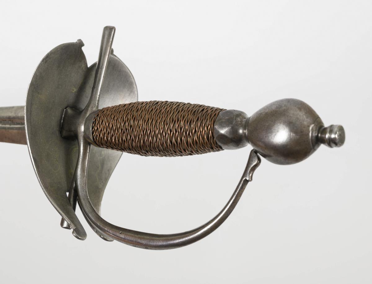Alte, zweischneidige Klinge mit schmalem Hohlschliff, darin gepunzt "Anthonio Pichinio". Am Übergang von Fehlschärfe zu Angel etwas Material weggenommen, zur Anpassung an das jüngere Eisengefäß, Klinge schartig. Herzförmiges Stichblatt mit abgebrochenem Abschluss. Kupferdrahtwicklung.