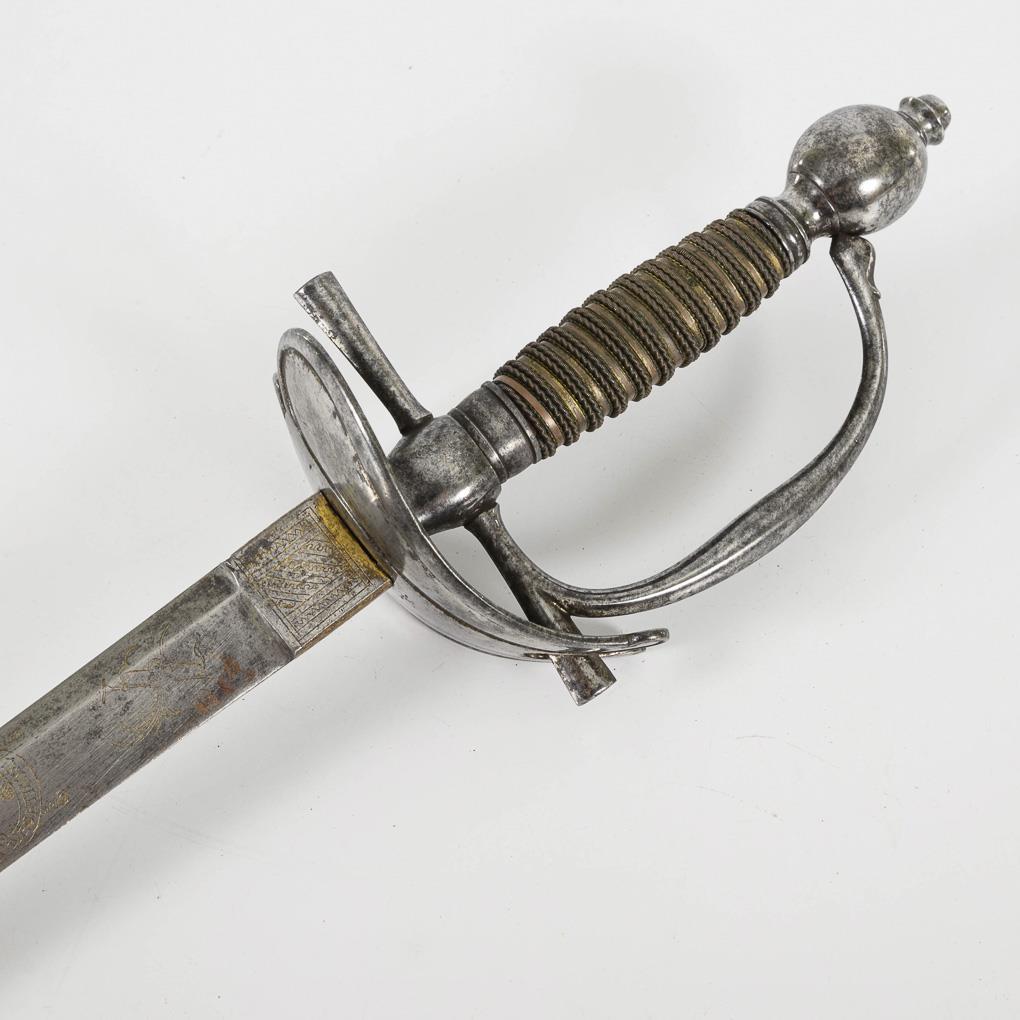 Gerade konische, zweischneidige Klinge mit seitlich versetztem Mittelgrat. Gravuren mit Resten von Vergoldung, darunter bekröntes Monogramm "GR" und Wappen des Vereinigten Königreiches. Eisengefäß mit herzförmigen Stichblatt und Kugelknauf sowie aufwändiger Drahtwicklung, dort ebenfalls Reste von Vergoldung .