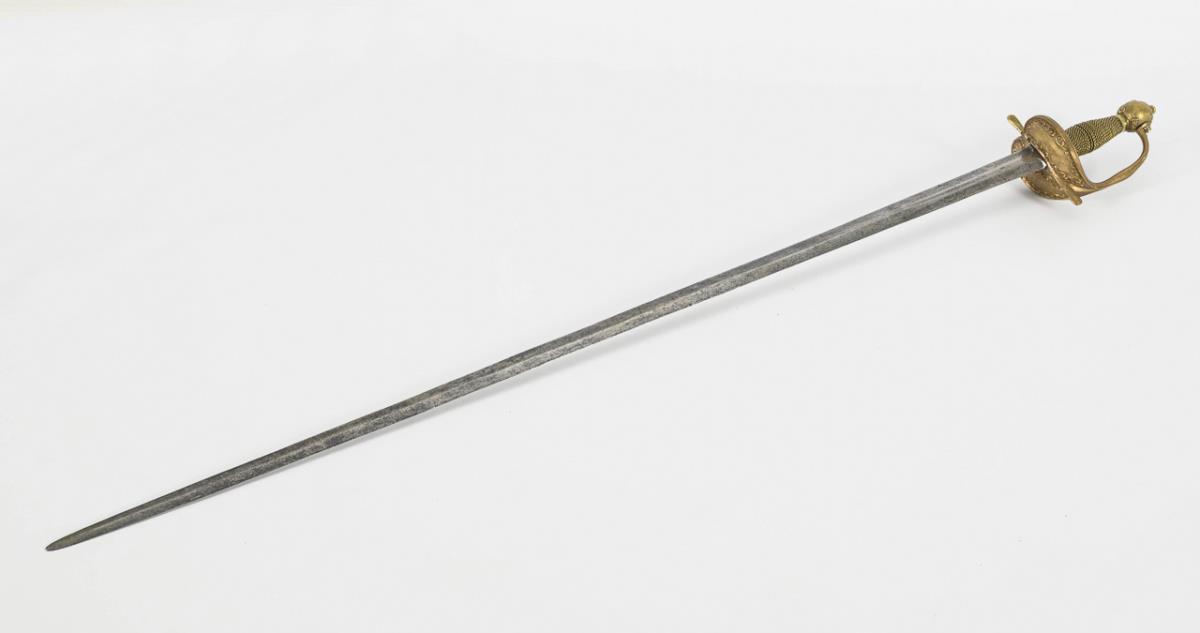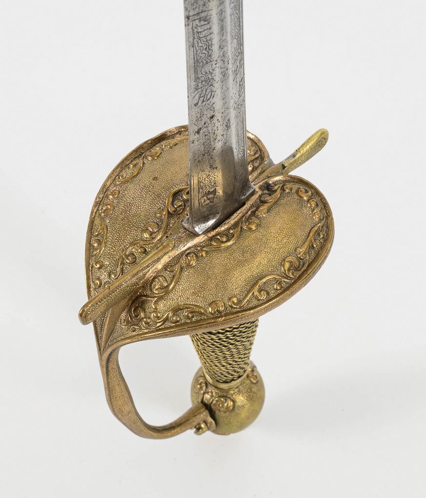 Zweischneidige Klinge, im Querschnitt sechskantig. Etwas graviert, beidseitig mit dem Spruch: "Honi soit qui mal y pense", teils stark berieben. Messinggefäß mehrteilig, an der Parierstange Lötspuren, Bügel am verzierten Kugelknauf angeschraubt. Drahtwicklung wohl jünger ergänzt.