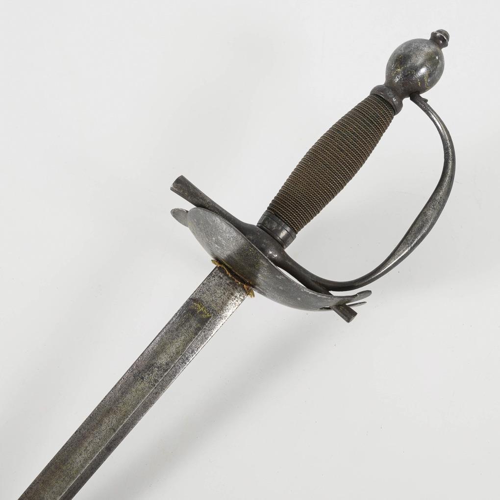 Gerade, einschneidige Klinge mit breitem Rücken und breitem Hohlschliff bis über die Hälfte. Herzförmiges Stichblatt mit angedeutetem Muschelende, gerade Parierstange. Ovaler Knauf mit Kugelniete. Griff mit Drahtwicklung.