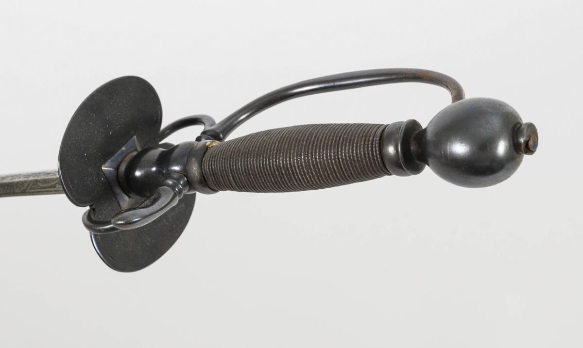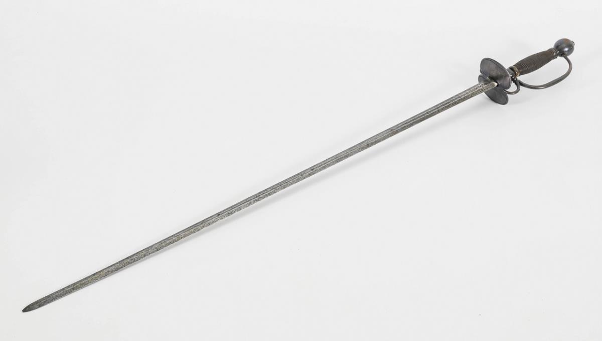 Gerade, zweischneidige Klinge mit sechskantigem Querschnitt. Unterer Teil der Klinge graviert, mit Spruch: Ne me tire pas sans raison, ne me remette point sans honneur". Kleines, nierenförmiges Stichblatt, zwei Fingergriffe, schlichter Griff mit Kugelknauf. Griff mit sehr feiner Drahtwicklung.