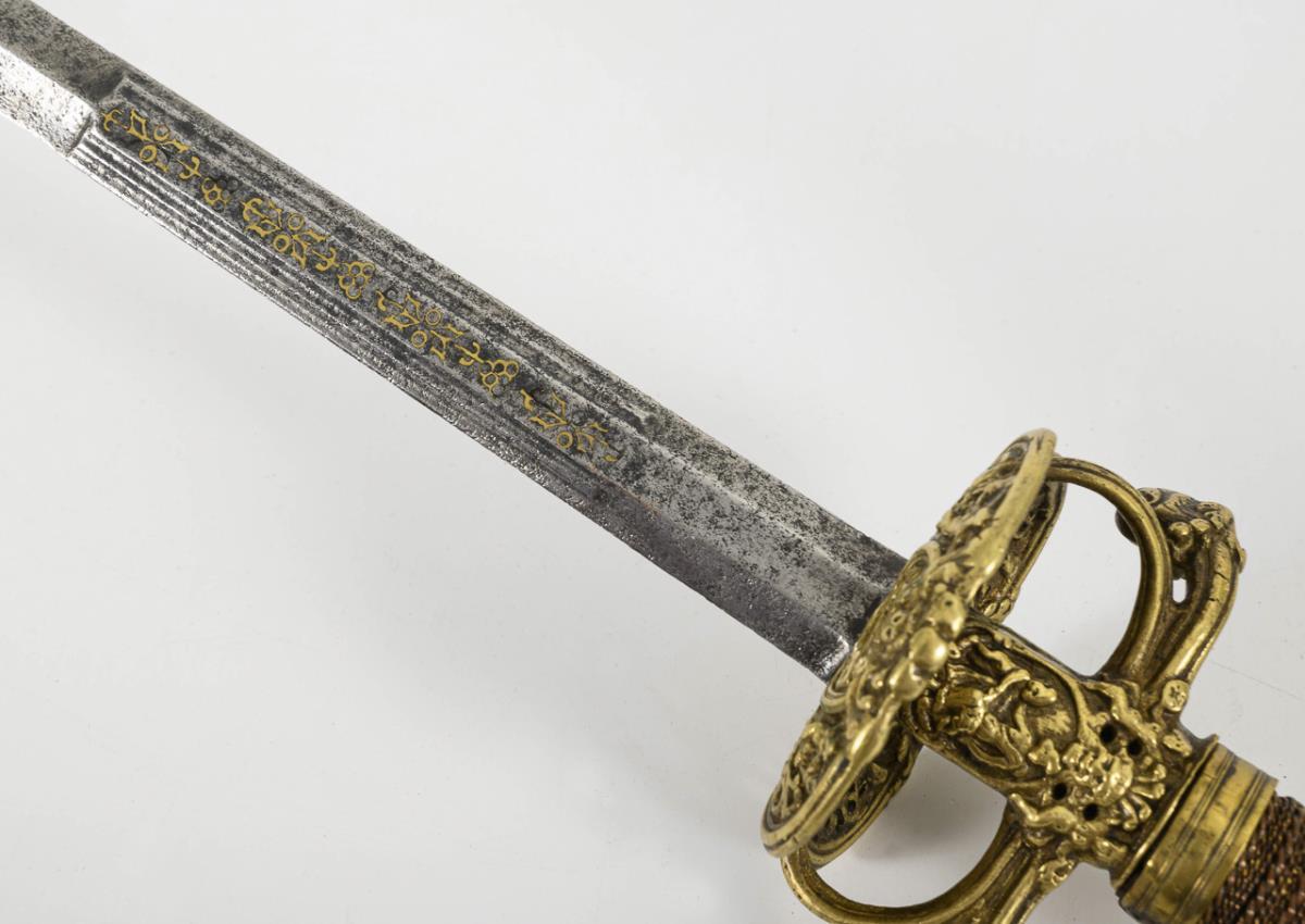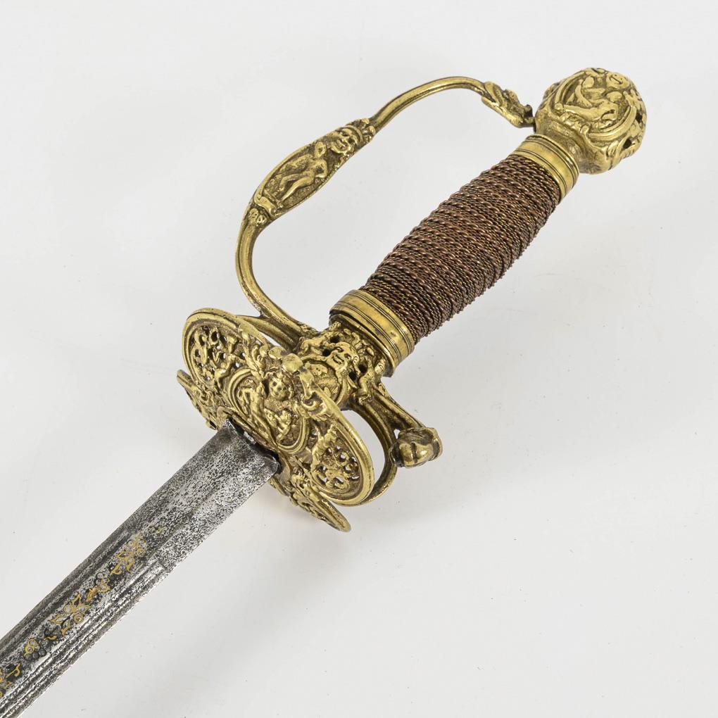 Gerade, zweischneidige Klinge mit Mittelgrat. Im unteren Teil abgestufte Klinge mit Goldtauschierungen (fehlerhaft). Reliefiertes Messinggefäß mit figürlichen Darstellungen, etwas verputzt. Drahtwicklung jünger ergänzt.