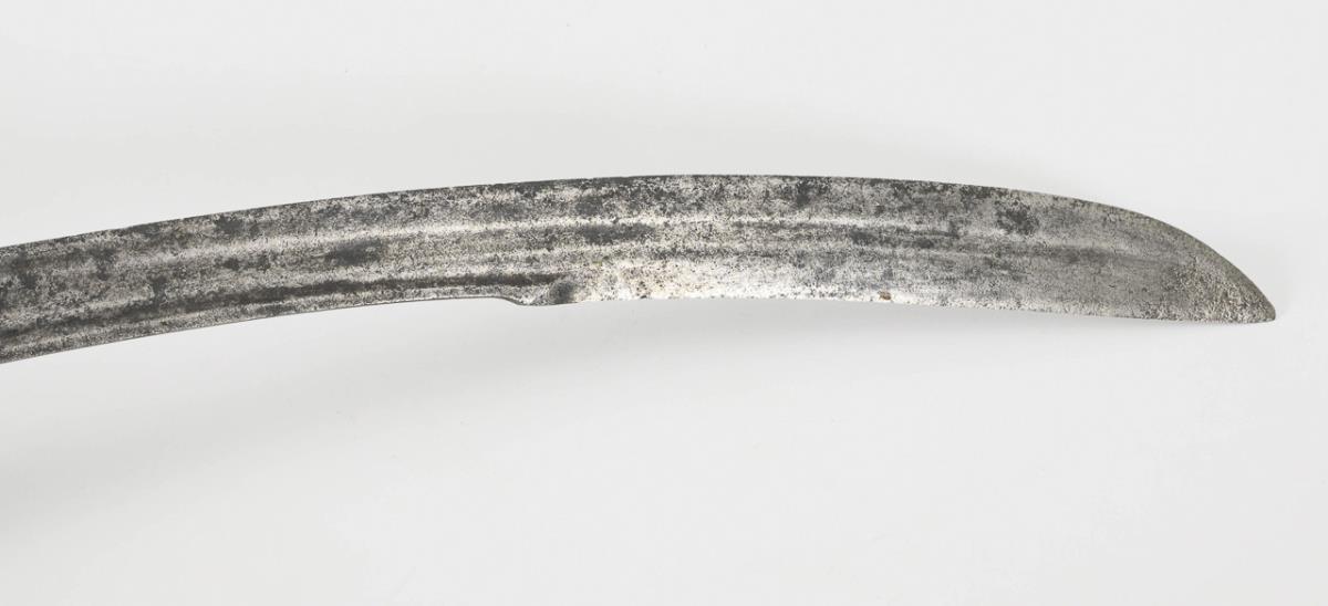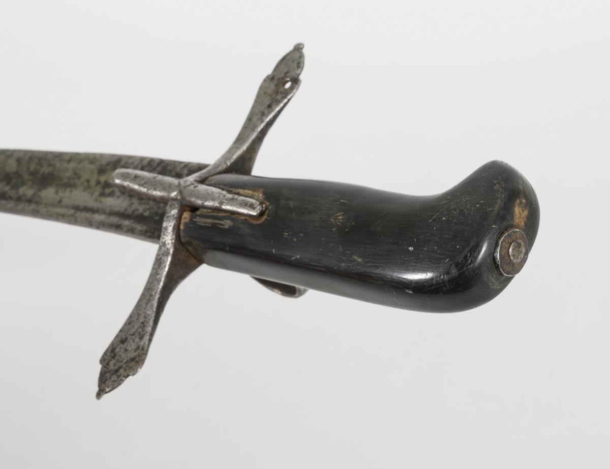 Stark gekrümmte, einschneidige Klinge mit Schör und flachem Hohlschliff. Griff aus Horn, Daumenring und einfache Parierstange mit einer Durchbohrung.