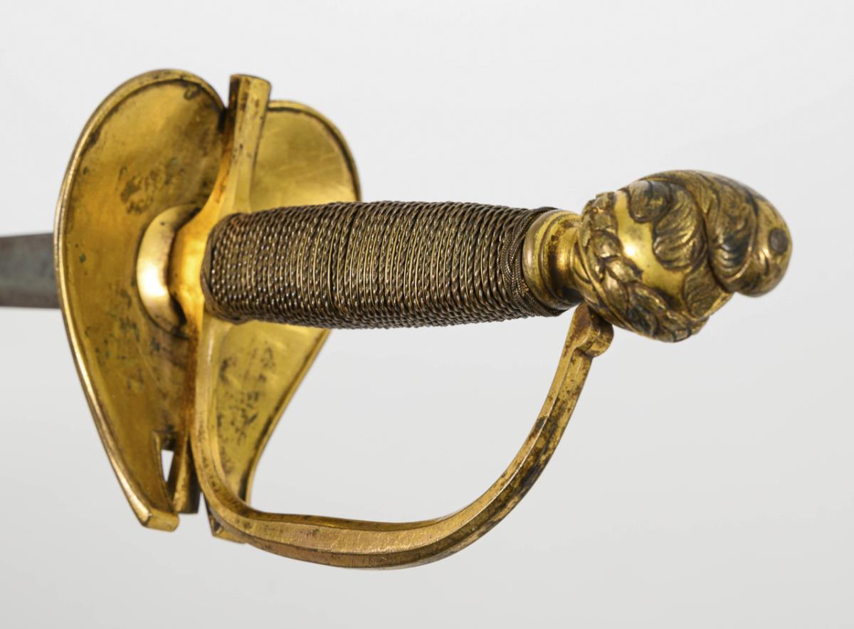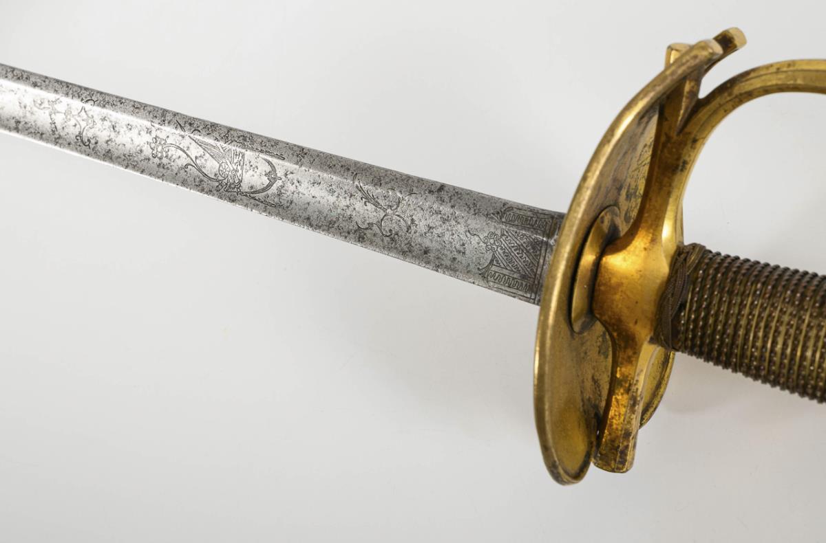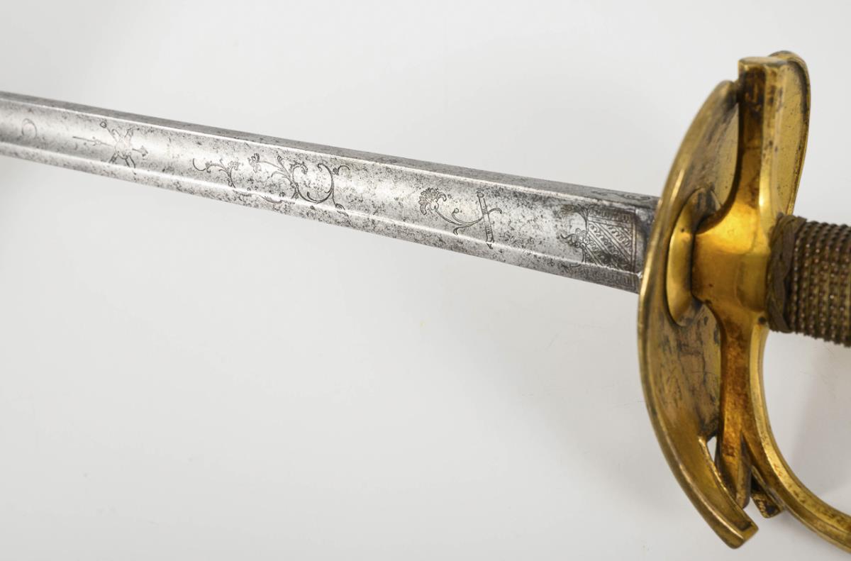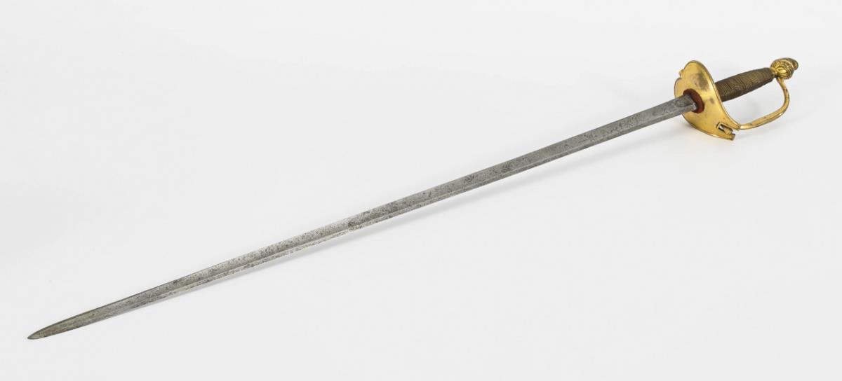 Gerade, einschneidige Klinge mit breiter Rückenlinie und breitem Hohlschliff bis fast zur Spitze. Beidseitig mit Ornamenten graviert. Gefäß vergoldet, herzförmiges Stichblatt und gerade Parierstange, mehrkantiger Bügel, Helmknauf. Griff mit Drahtwicklung (ergänzt?).