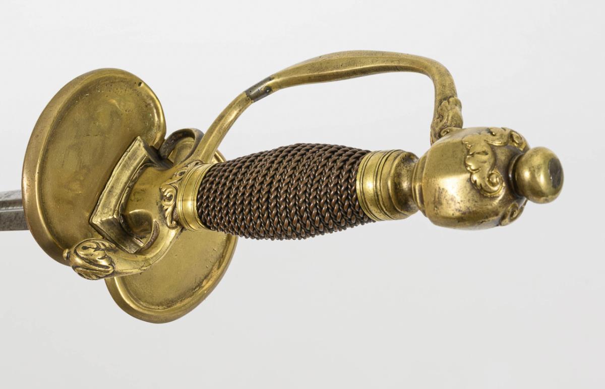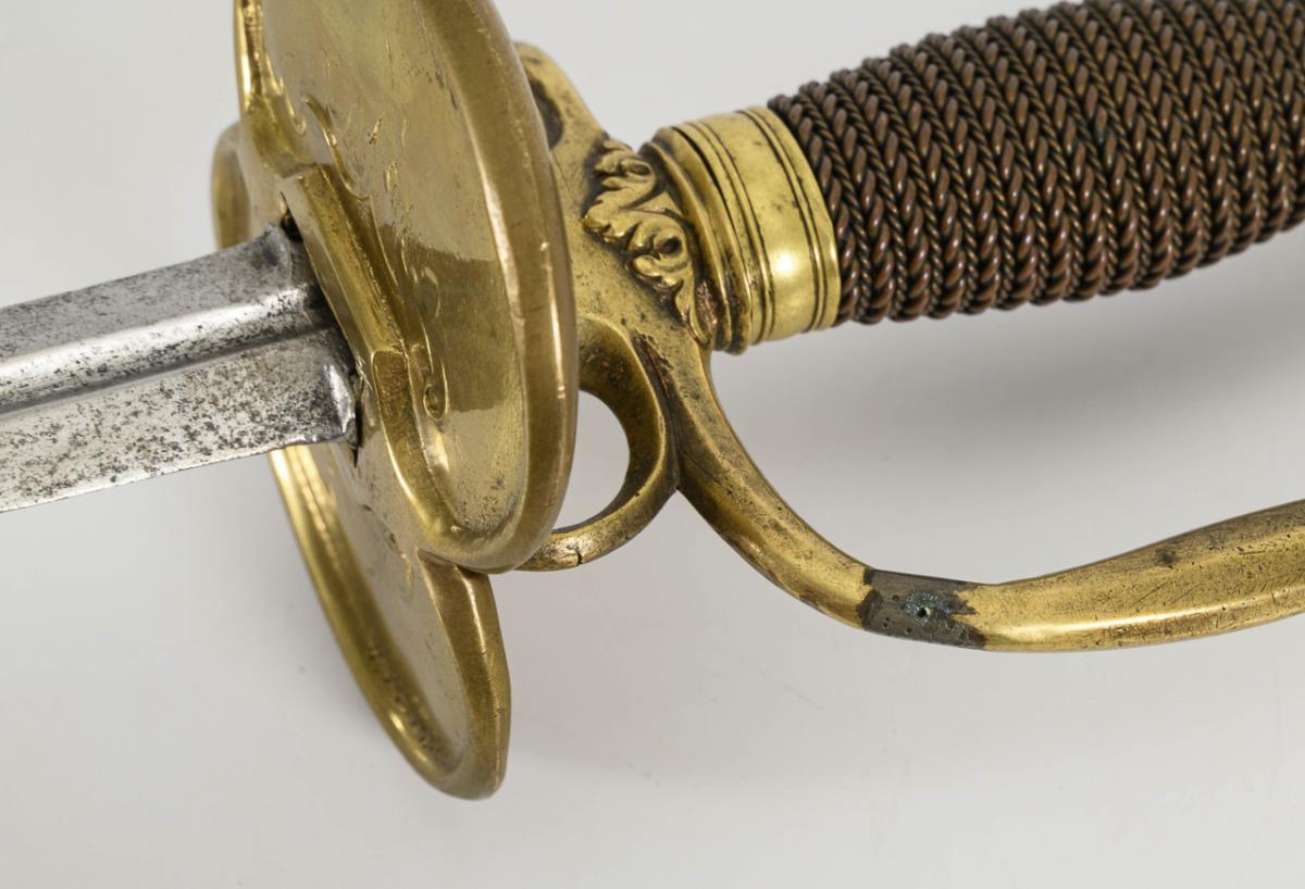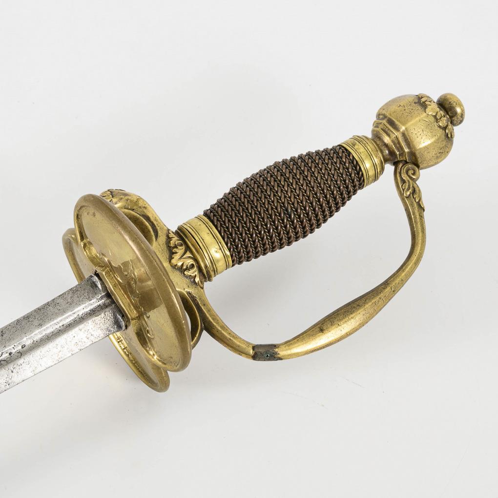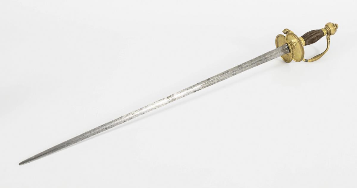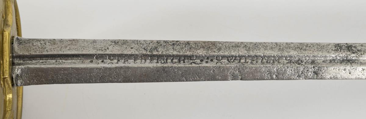 Gerade, zweischneidige Klinge mit schmalem Hohlschliff im unteren Drittel, darin gepunzt "FREDERICH", etwas verputzt. Messinggefäß mit nierenförmigem Stichblatt, zwei Fingergriffen. Bügel und gebogene Parierstange mit unauffälligem Riss bzw. Reparaturspur. Mehrkantiger Knauf.