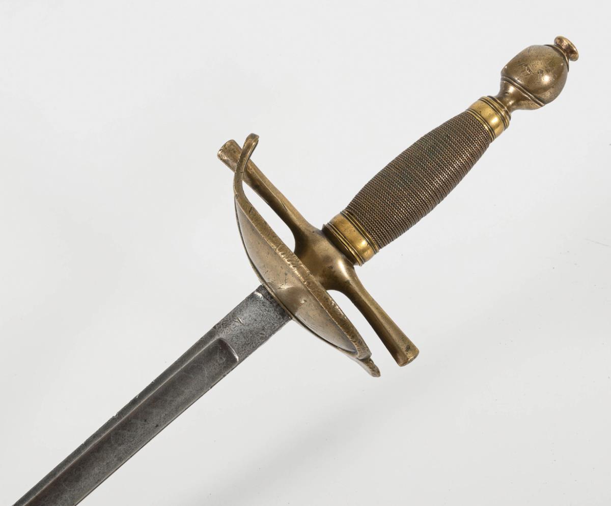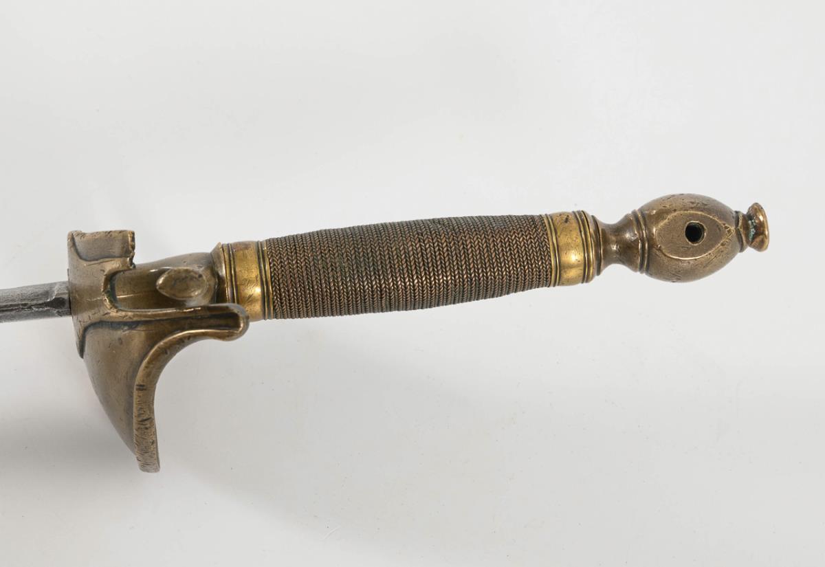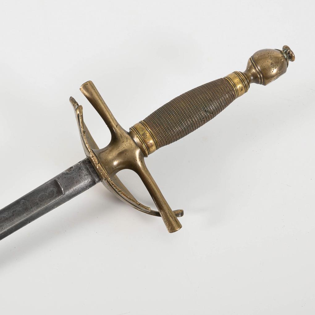 Einschneidige Klinge mit breitem Hohlschliff, Spitze abgerundet. Stichblatt einseitig abgetrennt, Bügel fehlt. Niete ergänzt.