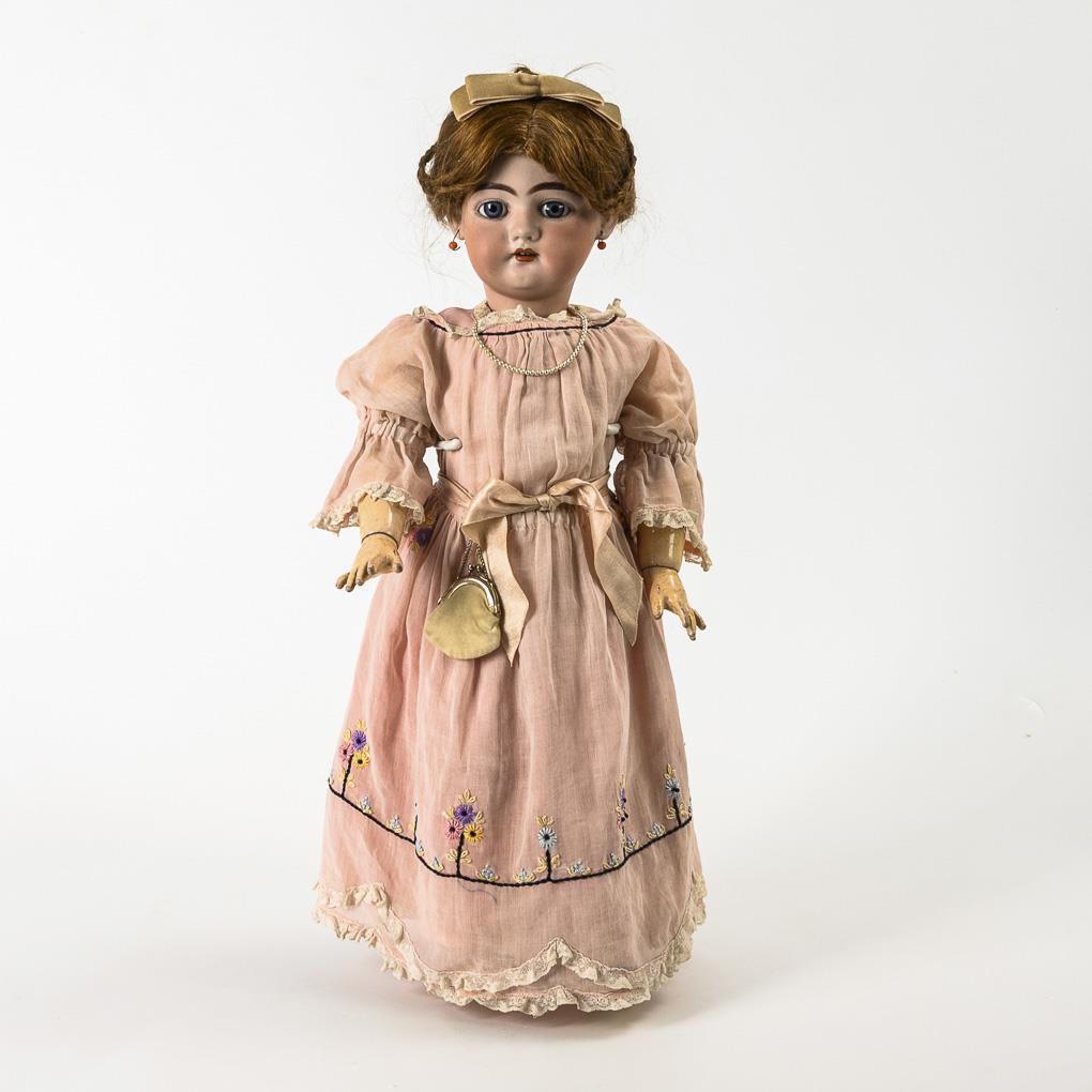 Kurbelkopf, blaue Schlafaugen, Ohrringe, rotbraune Echthaarperücke. Schön modellierter, 17-teiliger Gliederkörper mit feinen Händen. Besticktes altes Kleid, Täschchen, weiße Wachstuchschuhe. Kopf durchleuchtet: ohne Defekte.