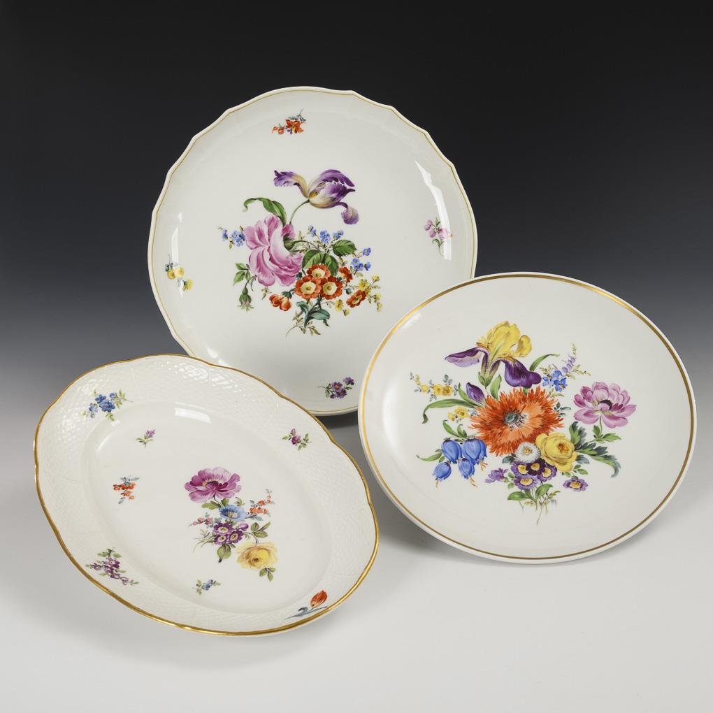 Wandteller, Kuchenteller und Platte mit Blumenmalerei. Meissen.