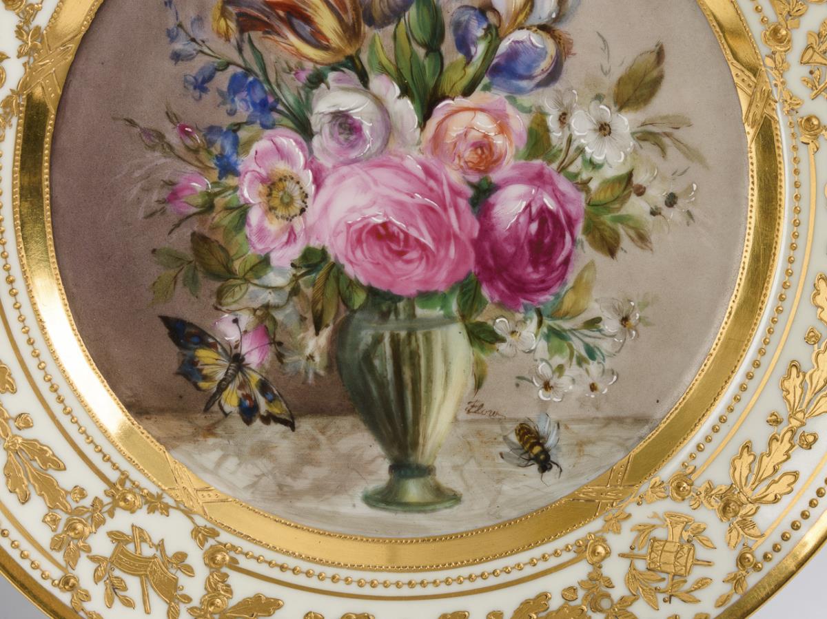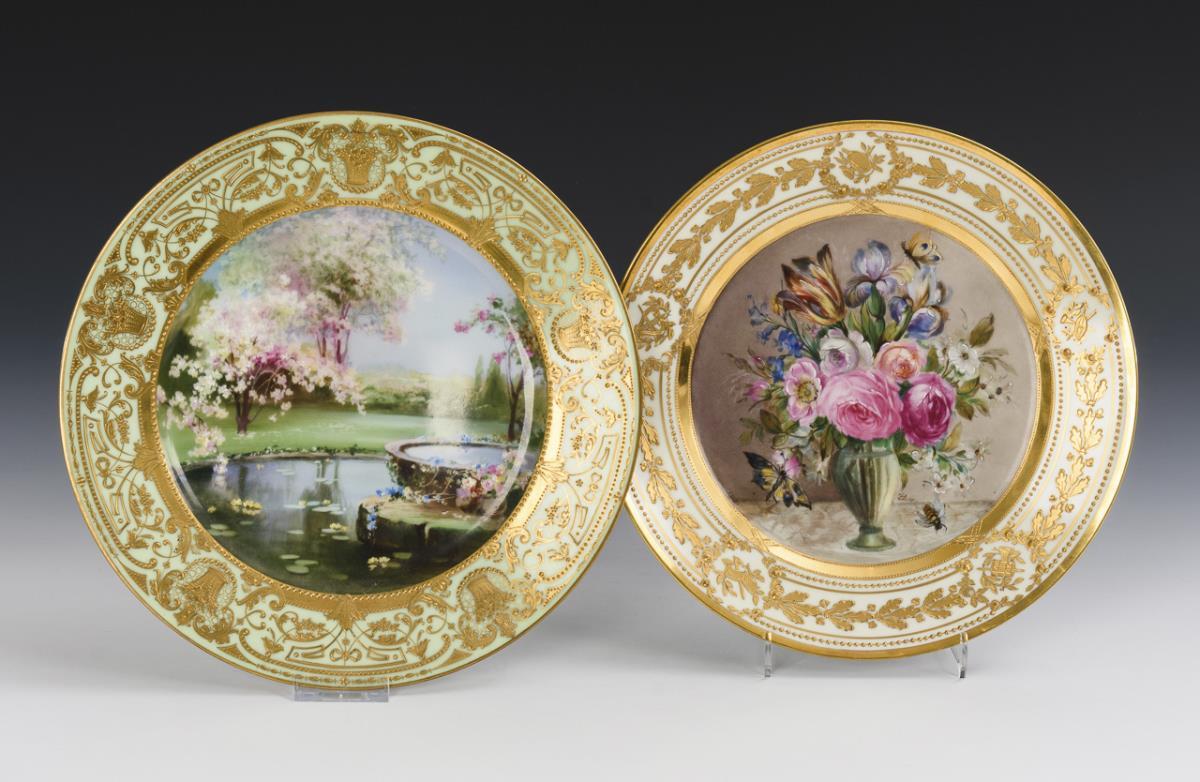 Beide mit prunkvoller, ornamental reliefgoldbemalter Fahne. 1x Potschappel, signiert "Flow": im Spiegel die Darstellung eines Blumenstraußes mit Insekten. / 1x Lamm/Dresden: im Spiegel die Darstellung einer blühenden Parklandschaft mit Brunnen und Teich. 1 Teller mit 3 kleinen Fehlstellen; 1 Teller mit 1 kleinen Fehlstelle ( am Rand in der Goldmalerei).