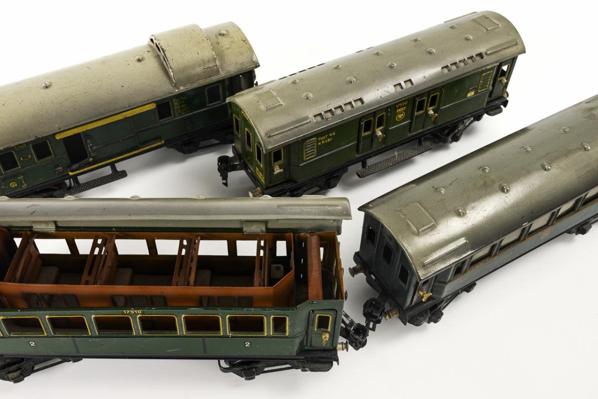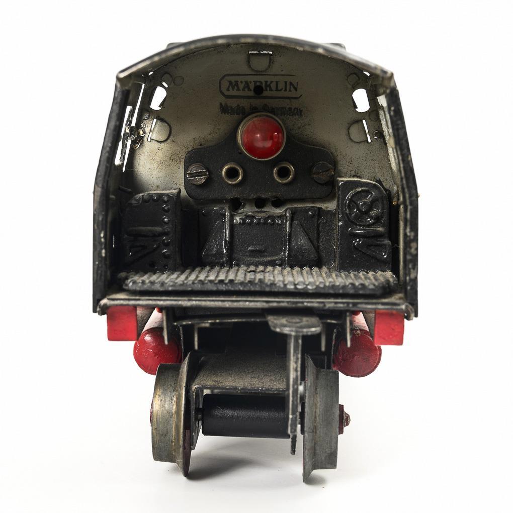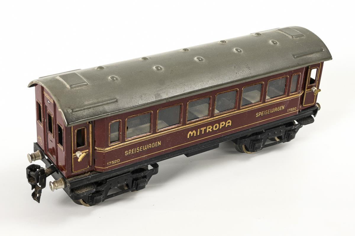 Spur 0. Für Elektrobetrieb. Schwarze Lok "03 256" aus Eisenguss (2C1) mit Tender. Dazu 2 grüne Güterwagen, 1 Mitropa-Speisewagen mit Einrichtung, 1 Personenwagen und 1 Speisewagen "Voiture Restaurant - Dining-Car". Bespielt, leichte Altersspuren, Funktion nicht gepfüft.