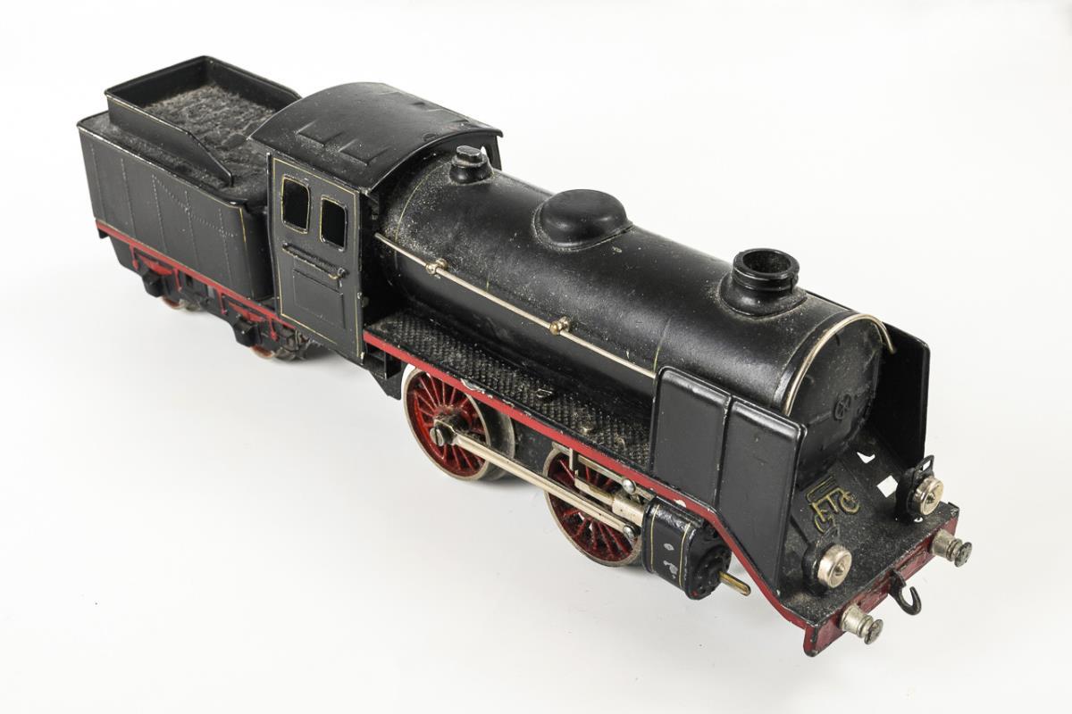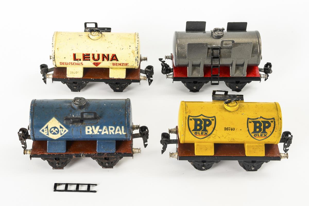 Spur 0. Schwarze Uhrwerk-Lok mit intaktem Werk und Schlüssel, dazu Tender (L zusammen 34 cm). 7 Mineralöl-Kesselwagen: 2x Esso, 2x Aral, 2x Leuna und 1x BP, darunter einer mit Bremserhäuschen (L 13 / 18 cm). Bespielt, unterschiedliche Erhaltung, 1x neu lackiert.