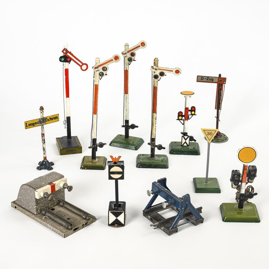 Verschiedene Signale (davon 3 für Elektrikbetrieb), 1 Fahrtrichtungsanzeiger und 2 Märklin-Prellböcke. Altersspuren, kleine Defekte und Klebestellen.