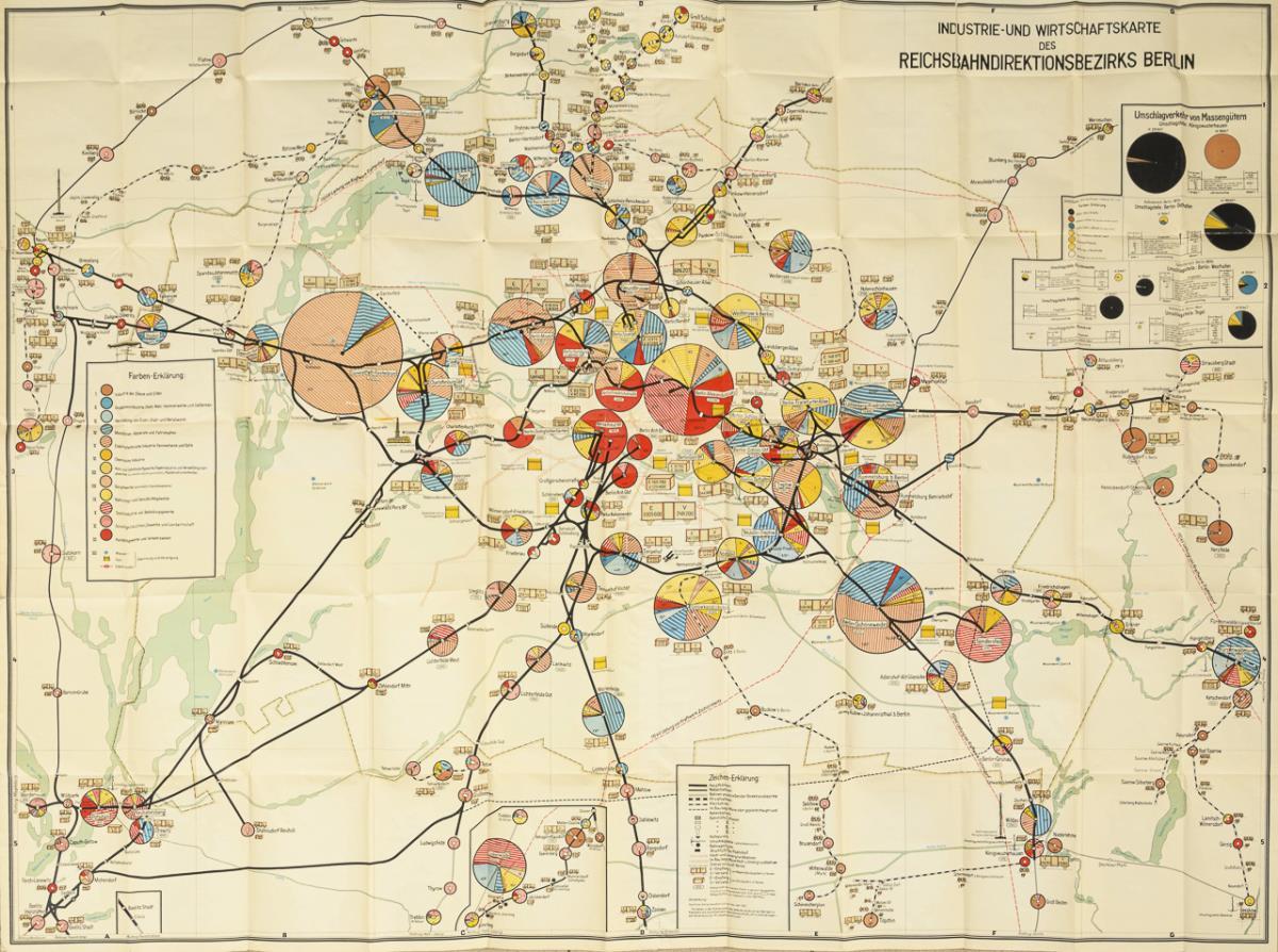 Sie befinden sich hier: Startseite Kategorien Varia Seltene, sehr große "Industrie- und Wirtschaftskarte des Reichsbahndirektionsbezirkes Berlin"