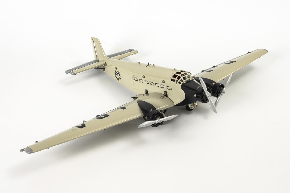 Flugzeugmodell eines der populärsten Flugzeuge aus den 1930er Jahren, mit Uhrwerk-Motor zum Antrieb der 3 Propeller, beweglichen Steuerflächen und Pilotenkanzel zum Öffnen. Werk intakt, ohne Schlüssel. Dazu Anleitung und Zertifikat. Guter Zustand.