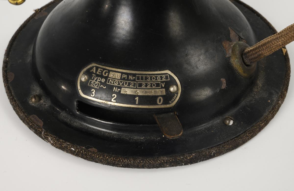 Eisen schwarz lackiert auch goldbronziert, Messing, Aluminium(?). Je 220 V Wechselstrom. H maximal 40 cm, Ø maximal 32 cm. Zusammen 6,3 kg.