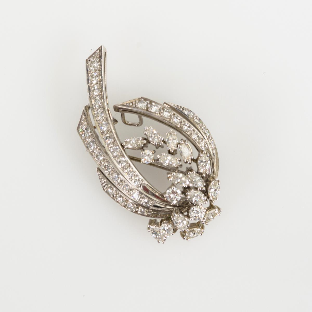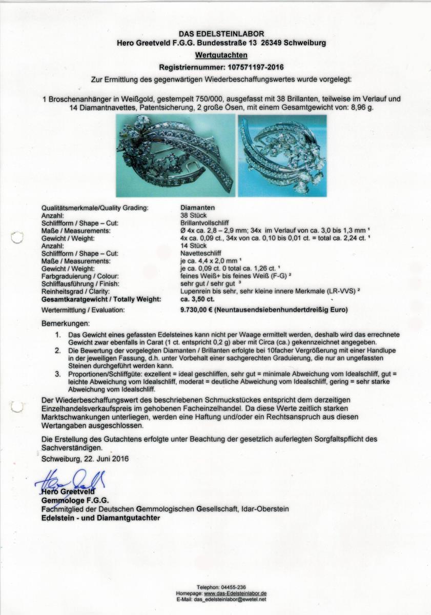 5 Bogenstege, besetzt mit 38 Brillanten und rispenförmig gearbeitete Mitte, besetzt mit 14 chatongefassten Diamant-Navetten. Schiebehaken, 2 starre Ösen.