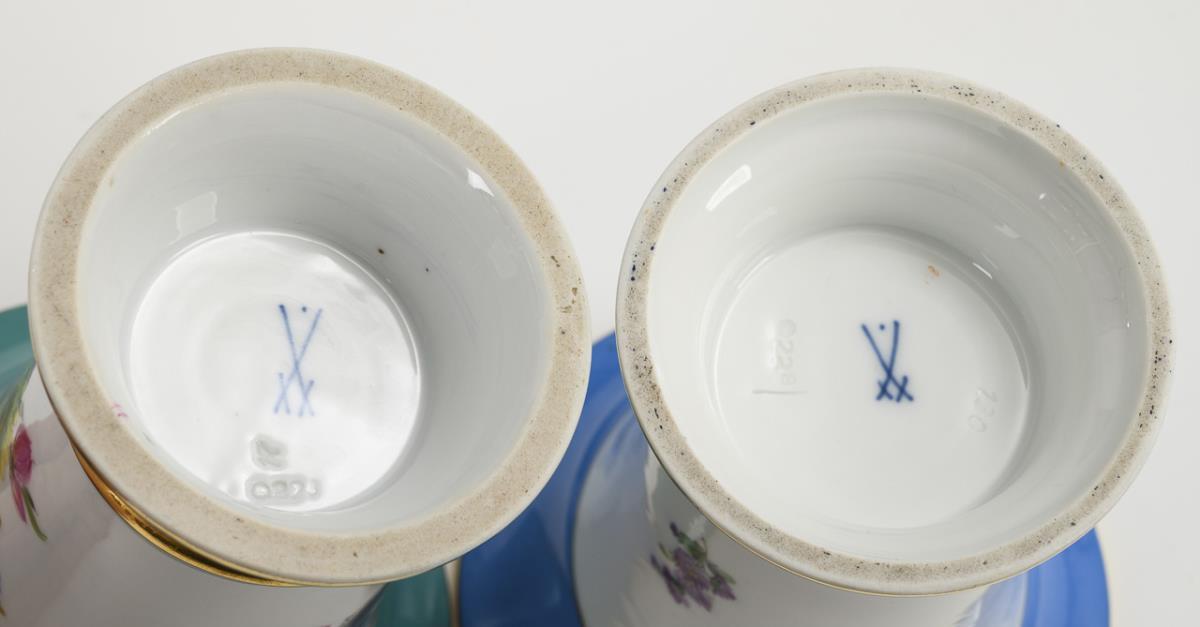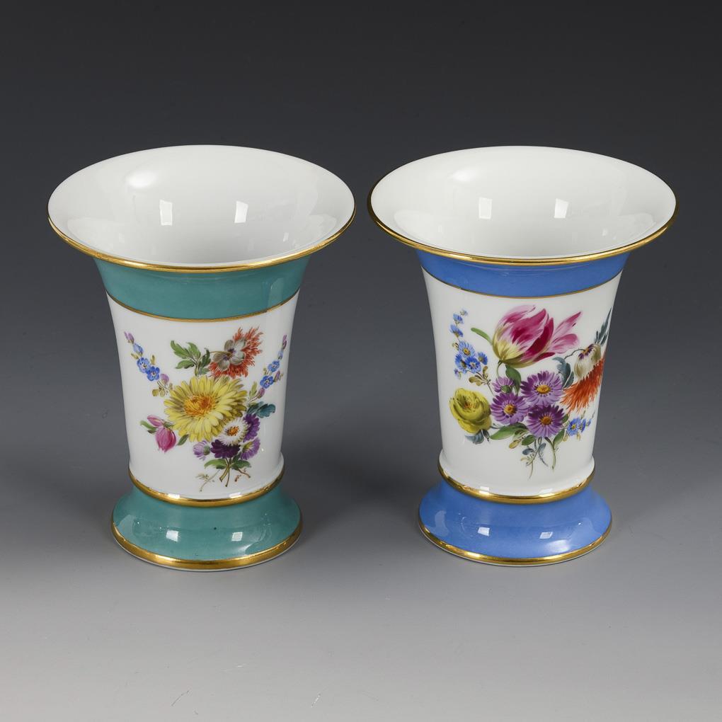 Kratervasen mit türkisfarbenem bzw. hellblauem Teilfond und beidseitig einem Blumenbukett.