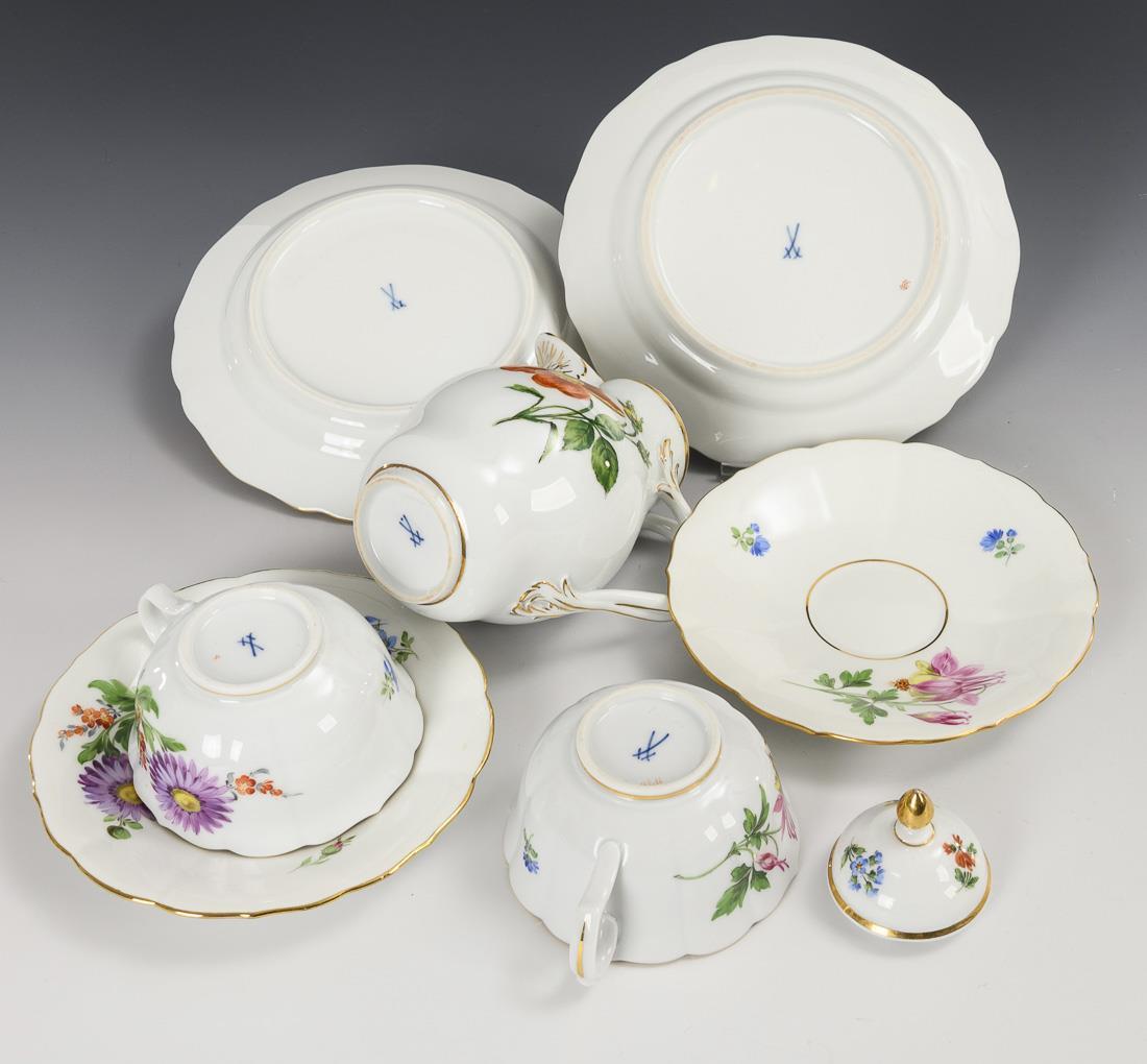 2 Gedecke und Kännchen mit Blumenmalerei. Meissen.