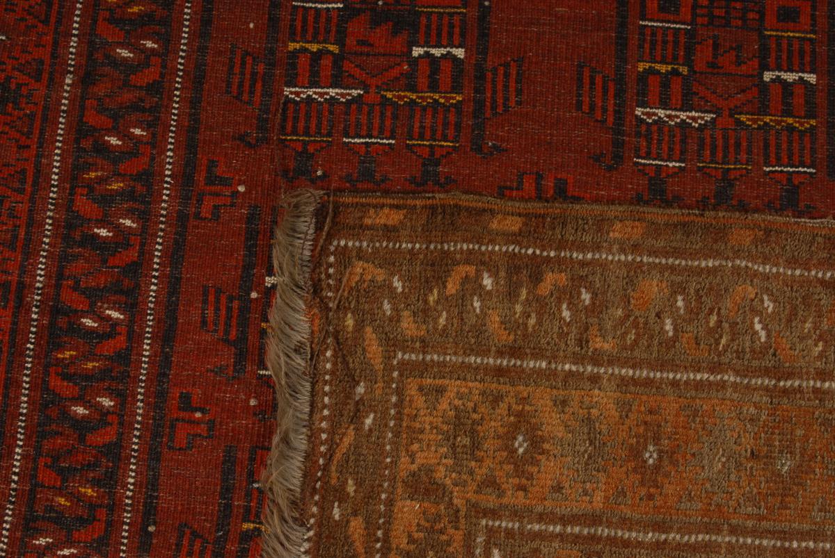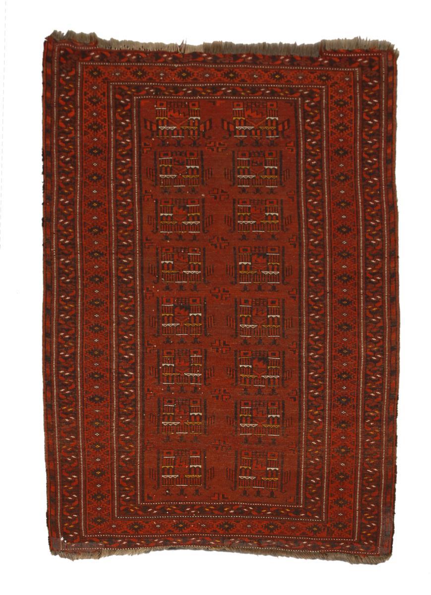 Wolle, handgeknüpft. Naturfarben mit Karminrot, Schwarz, Weiß und Gelb. Ca. 111 x 172 cm.