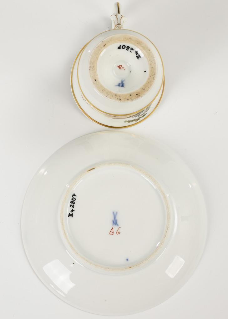 Polychrom bemalt, goldstaffiert. Tasse (H 10 cm), originale Untertasse (Ø 13,5 cm).