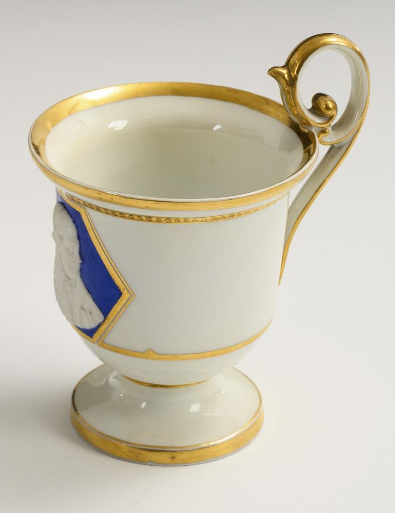 Gefußte Glockentasse mit Perlband und Rocaillehenkel. Schauseitig eine hexagonale Kartusche mit blauem Fond und dem Biskuitrelief von Martin Luther (1483-1546), im Spiegel der Untertasse der Spruch "Eine feste Burg ist unser Gott!". Untertasse restauriert.