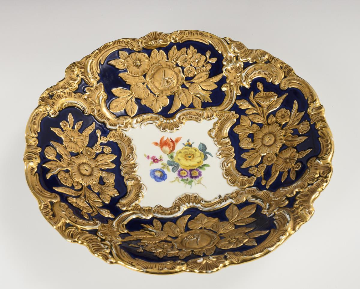 Schale mit goldbronziertem Floralrelief, kobaltblauem Teilfond und einem polychrom gemalten Blumenbukett im Spiegel.