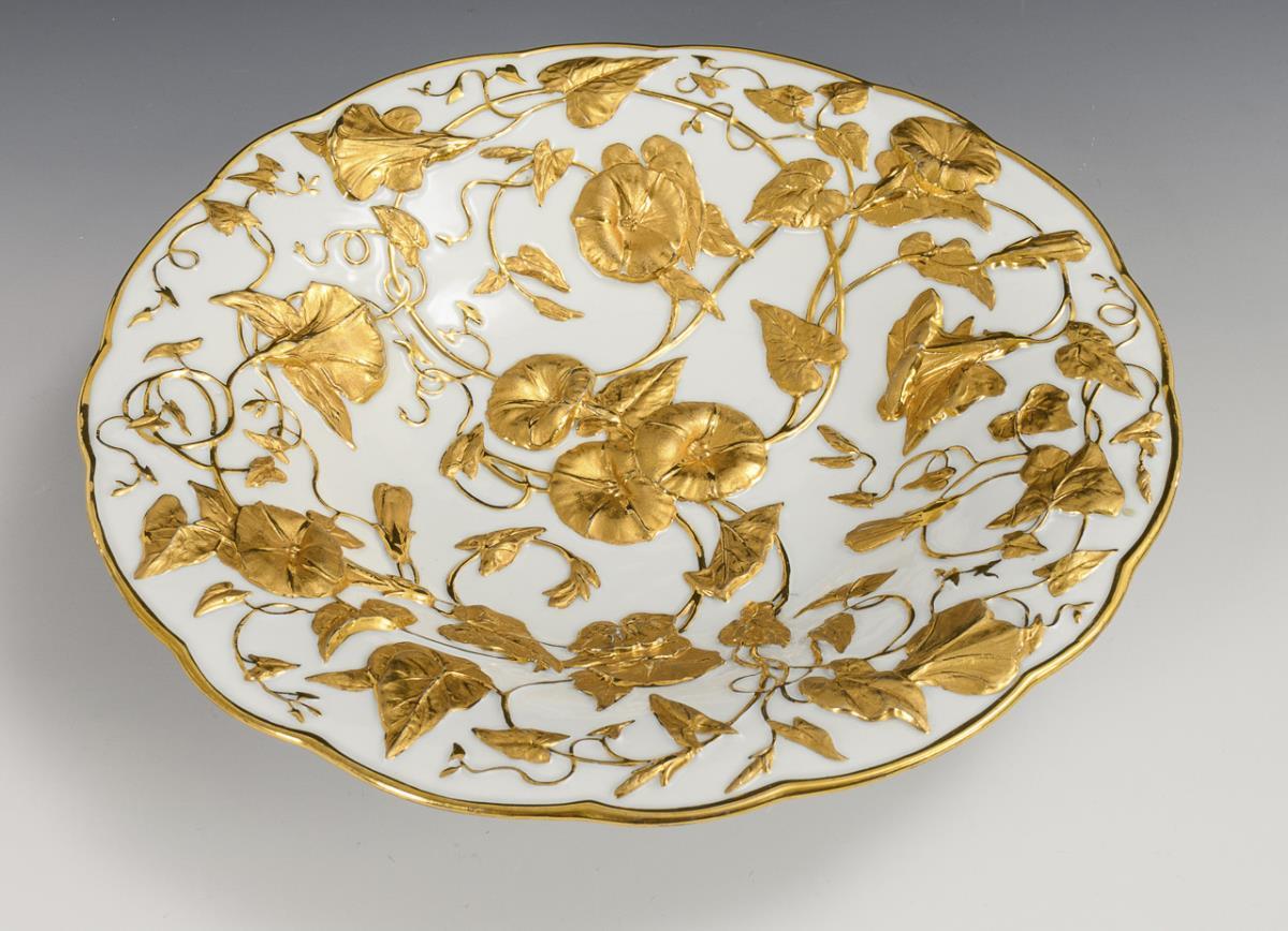 Schale mit goldbronziertem Wickenrelief. Minimaler Goldabrieb.