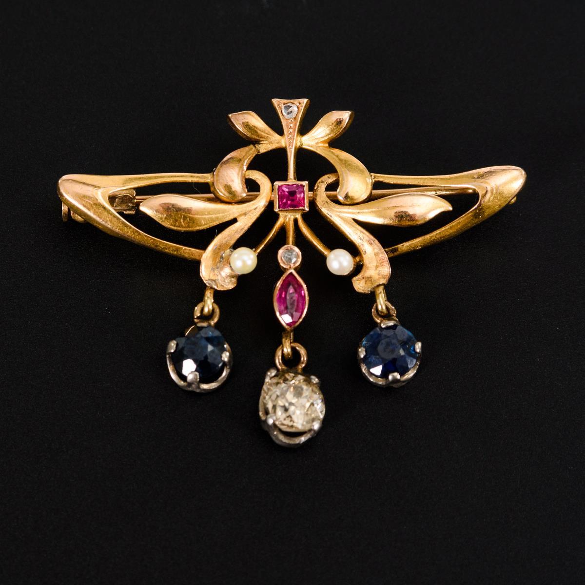 Jugendstil-Brosche mit Brillant, Saphiren und Rubinen.