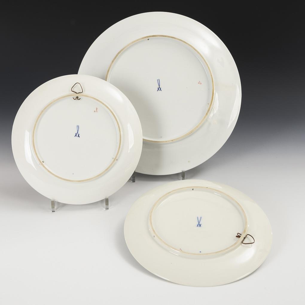 Glatte Teller, 2x mit dem Dekor "Mingdrache" in Grün und 1x mit dem Dekor "Mingdrache" in Gelb. Gold berieben.