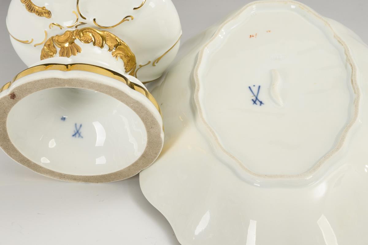 Vase "B-Form" (H 24,5 cm) und Ovalschale "Neubrandenstein" (L 26,5 cm). Vasenrand restauriert, partieller Goldabrieb.