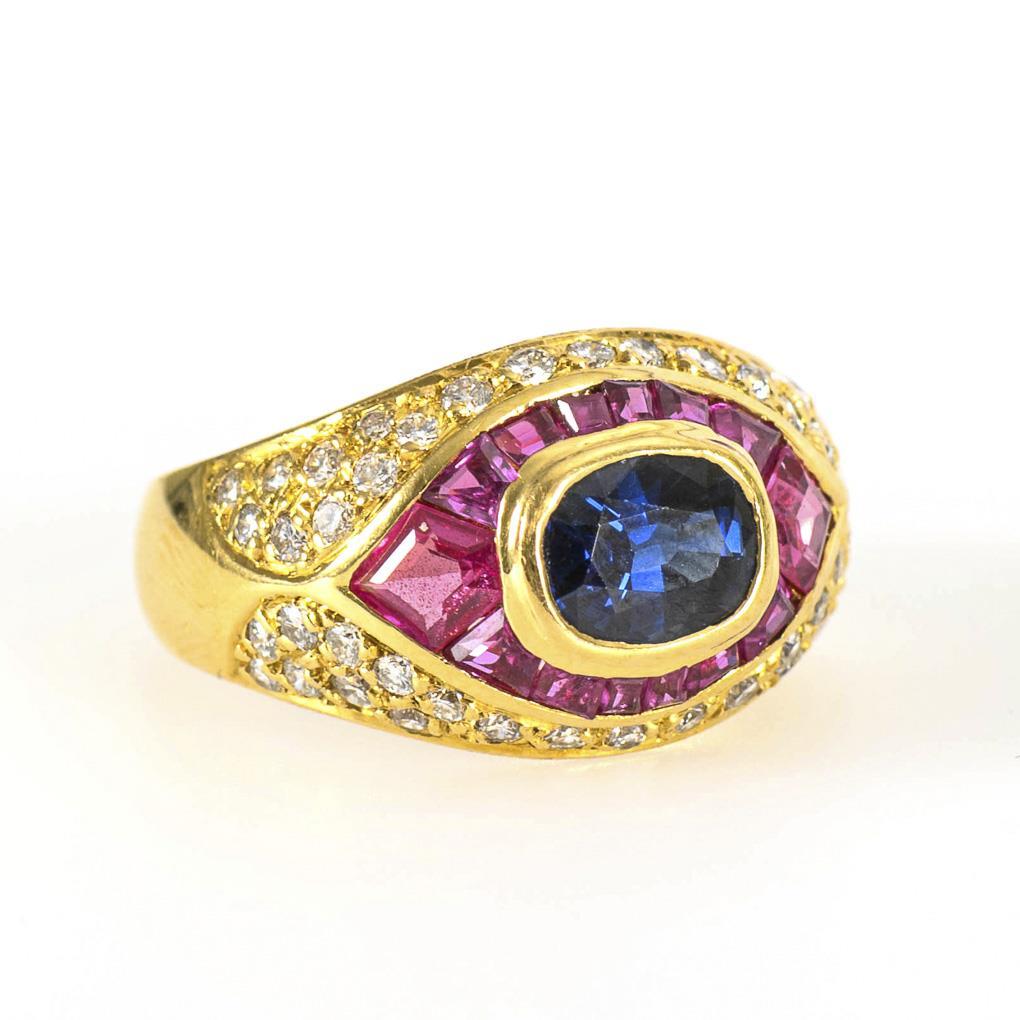 Ring mit Saphir, Rubinen und Brillanten.