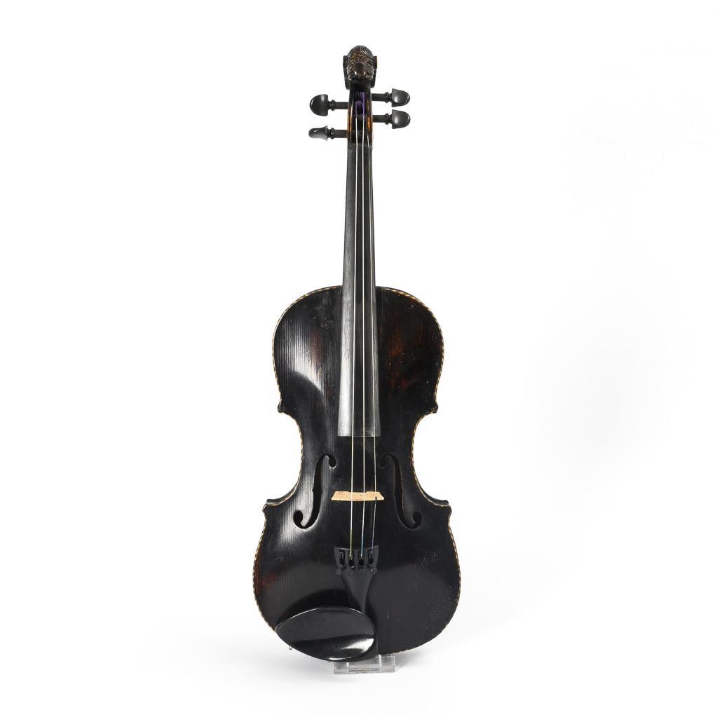 Schwarz lackierte Violine mit geschnitztem Löwenkopf anstelle der Schnecke sowie fadenförmige Randeinlagen. Brauner Geigenkoffer. Geklebter Deckenriss, geringe Ausbesserungen an den Randeinlagen, Löwenzunge fehlt, stärkere Alters-/Gebrauchsspuren auch am Koffer.