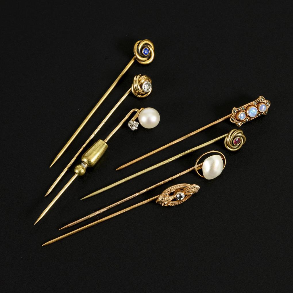 3 Knotenköpfe mit kleinem Farbstein sowie Brillant. Zuchtperle mit kleinem Brillant, Perlmuttteil, 3 zargengefasste Opalcabochons und Markasiten, reliefiertes Ornament mit hellem Stein. An langen Nadeln. 1 Metallschieber.