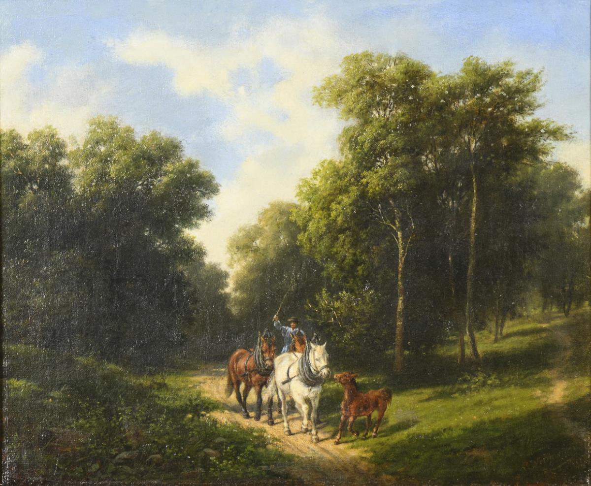 Der Bauer beim Antreiben der drei Pferde auf einem Weg durch den Wald im Sonnenschein. Leichte Altersspuren.