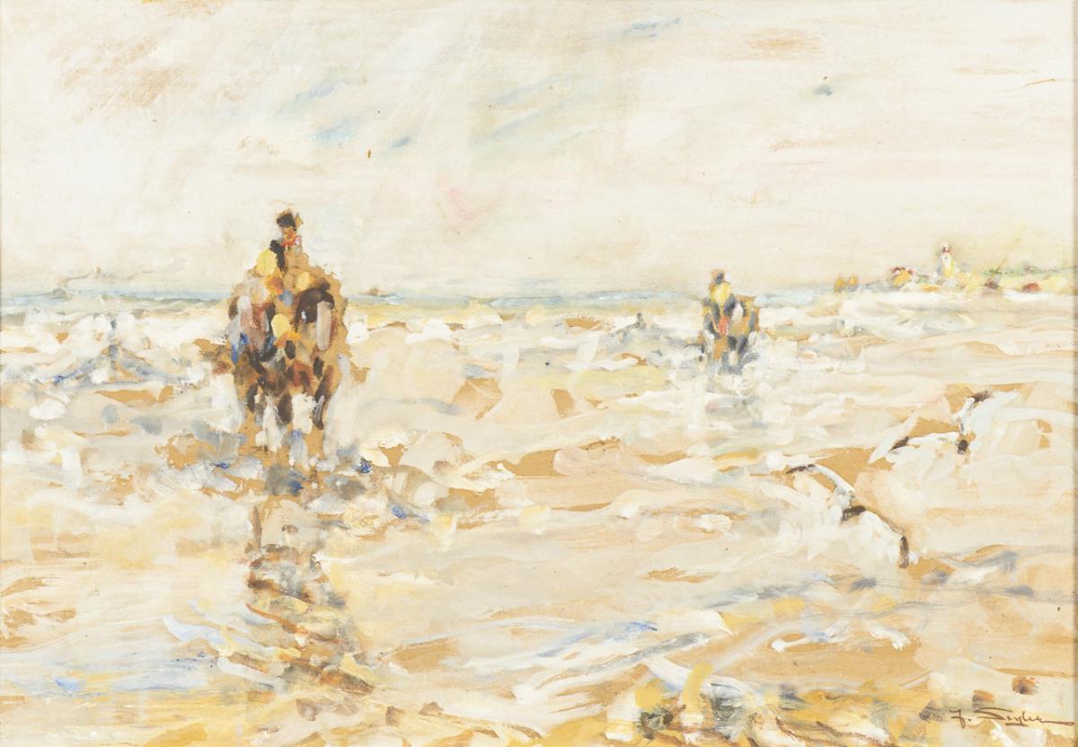 Strandansicht mit Reitern und Möwen unter hellem Himmel.