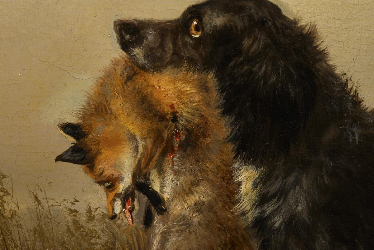 Der Hund mit dem erlegten Tier im Schnee nahe dem Waldrand. Leichte Altersspuren.