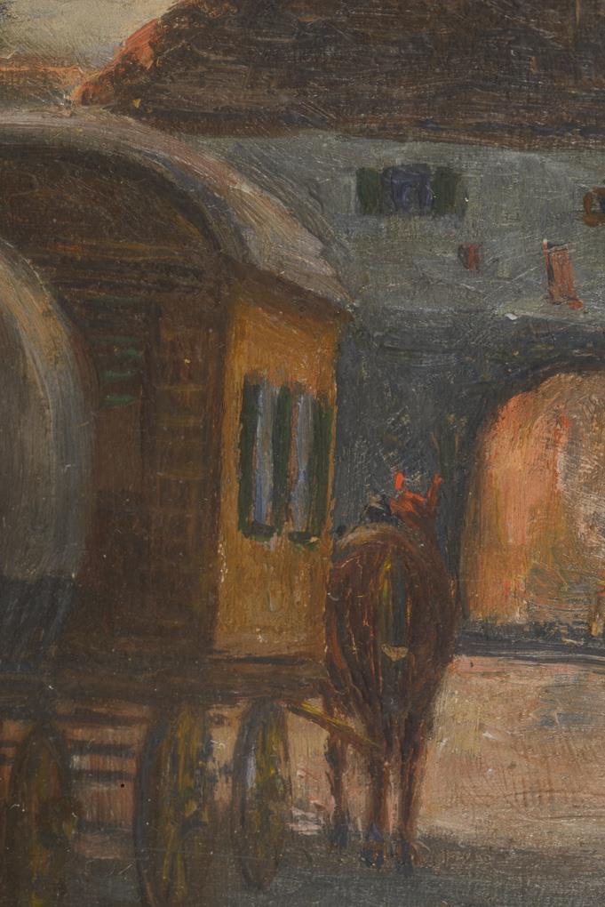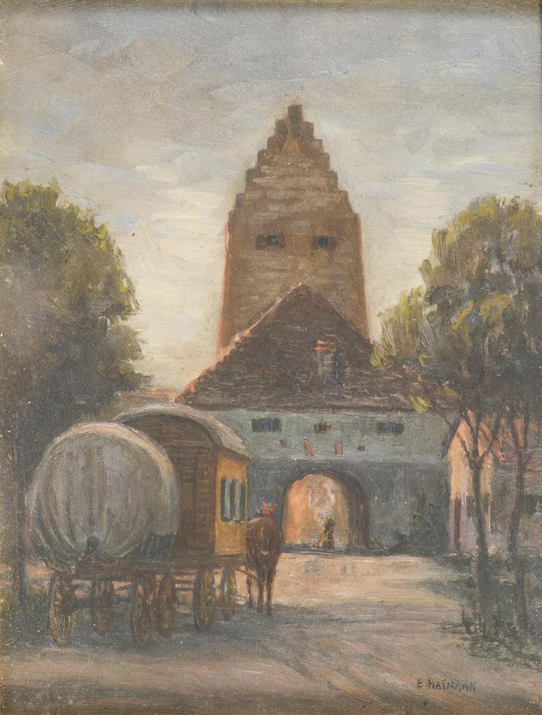 Staffagefiguren vor Turm sowie Kutsche nahe dem Torhaus vor der Stadt.