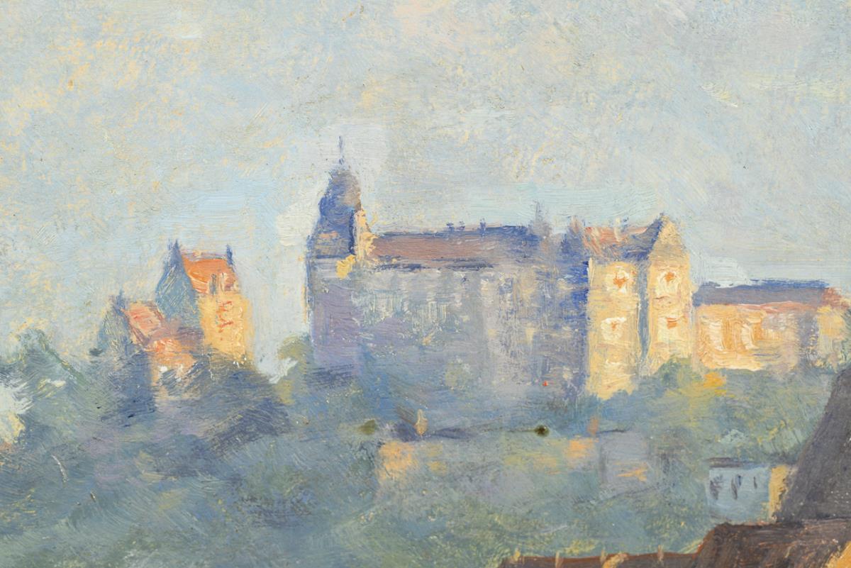 Boote auf dem Fluss vor der Stadt mit Schloss im Sonnenschein.