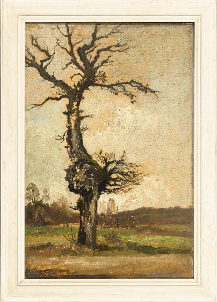 Karger Baum in weitem Feld vor Waldlandschaft. Minimale Altersspuren.