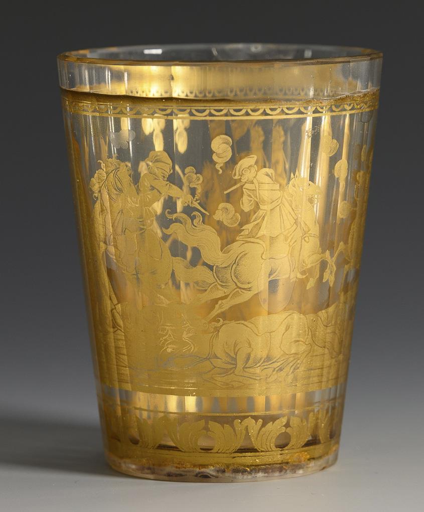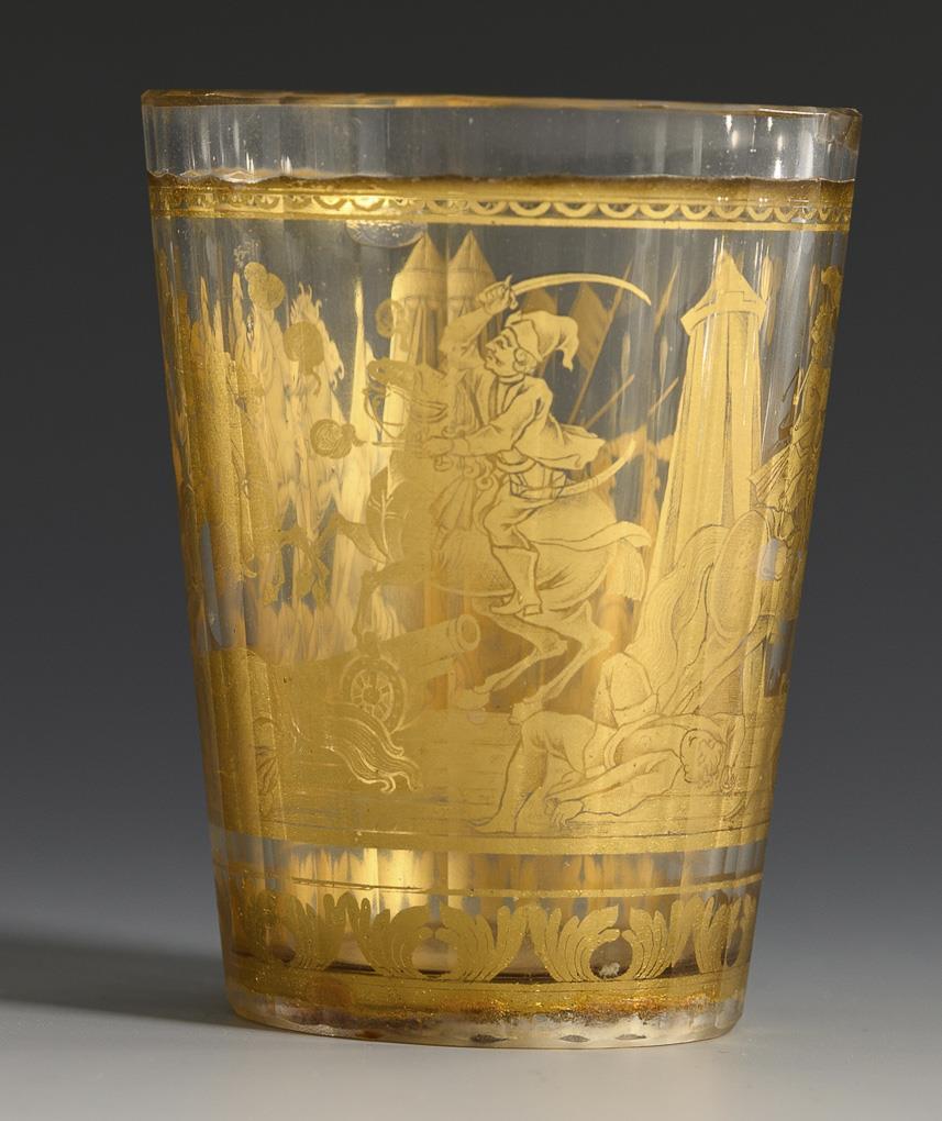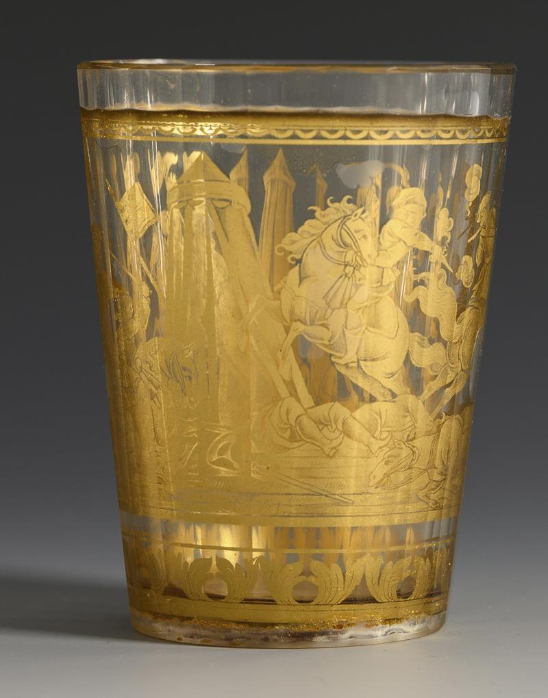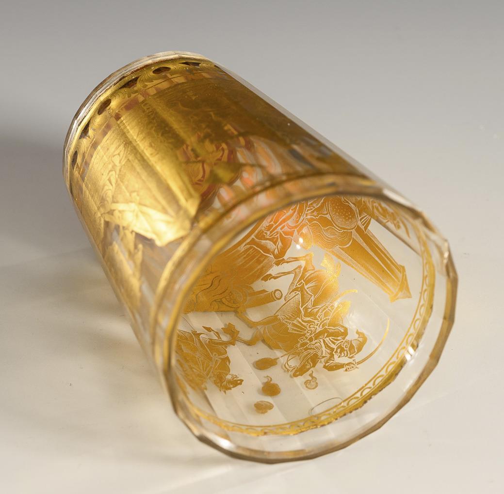 Konischer, facettierter Becher, in der Zwischenschicht radierte Goldfolie mit der Darstellung einer Reiterschlacht, im Boden Trophäenmotiv vor rotem Hintergrund. Chip und Spannungsriss am Mündungsrand.