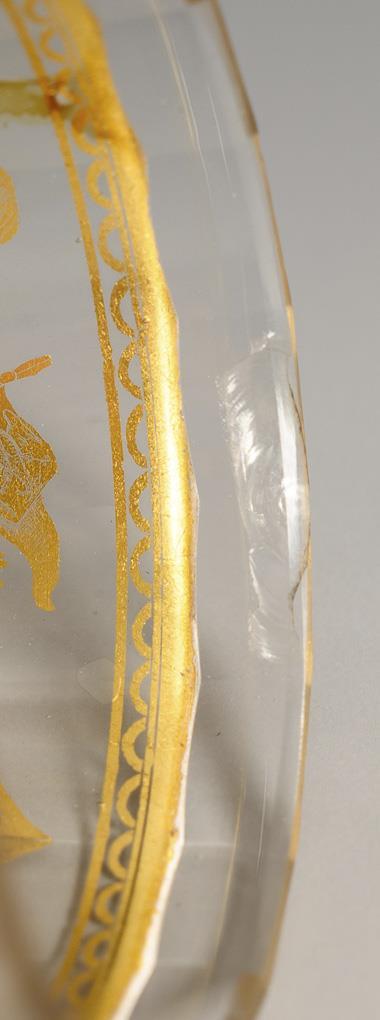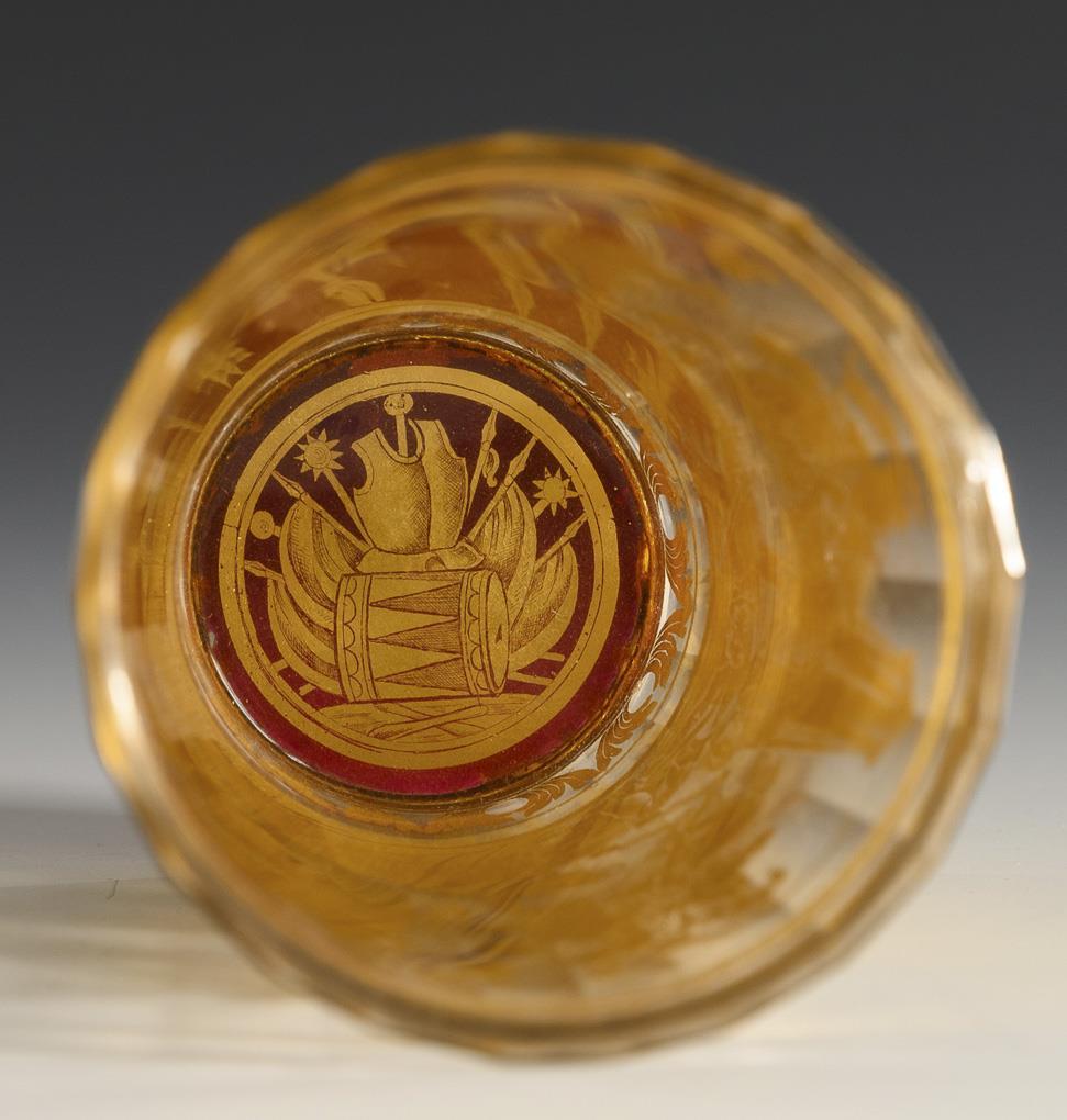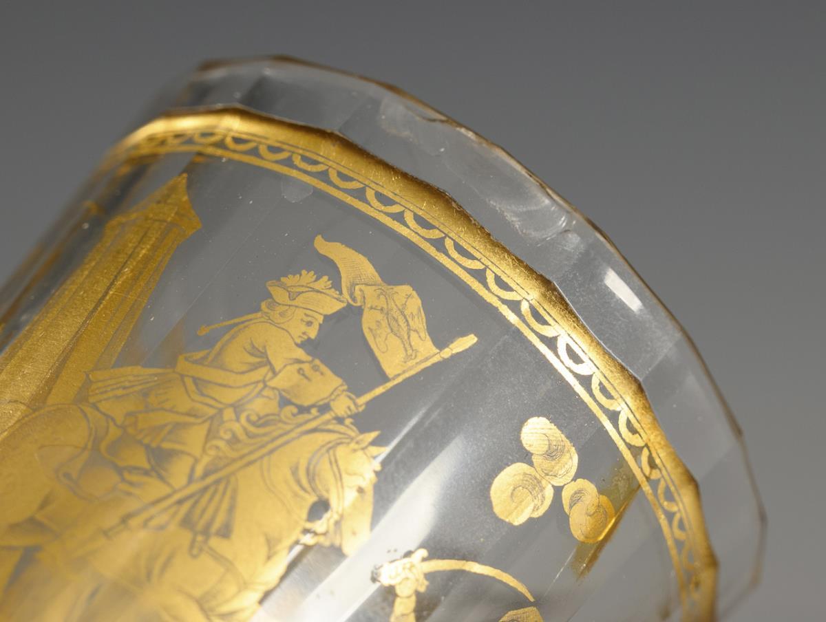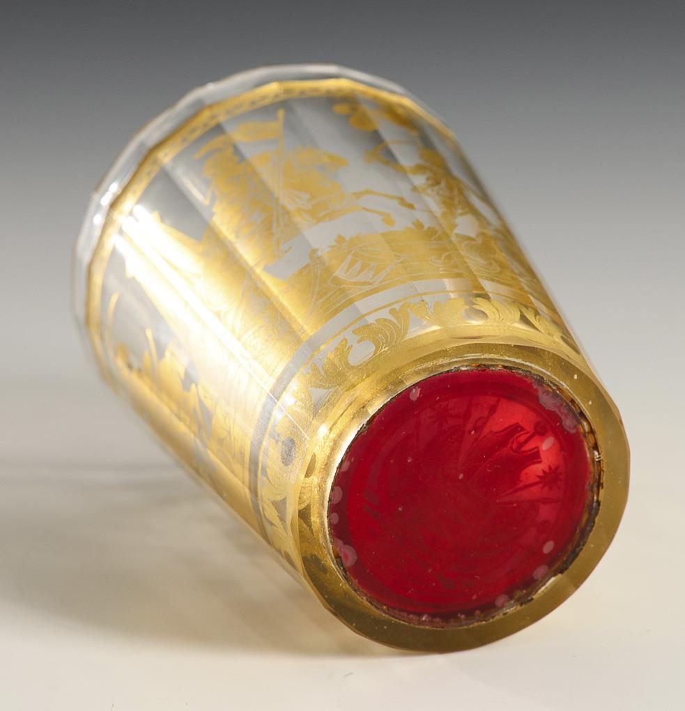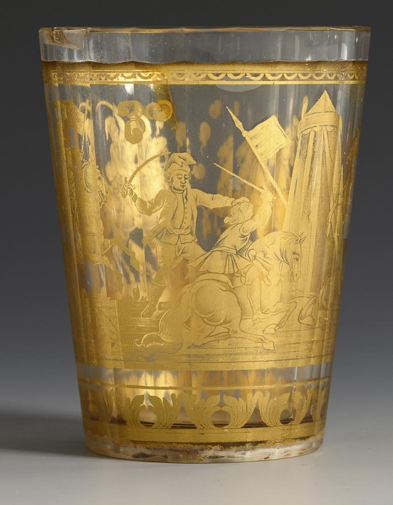 Konischer, facettierter Becher, in der Zwischenschicht radierte Goldfolie mit der Darstellung einer Reiterschlacht, im Boden Trophäenmotiv vor rotem Hintergrund. Chip und Spannungsriss am Mündungsrand.