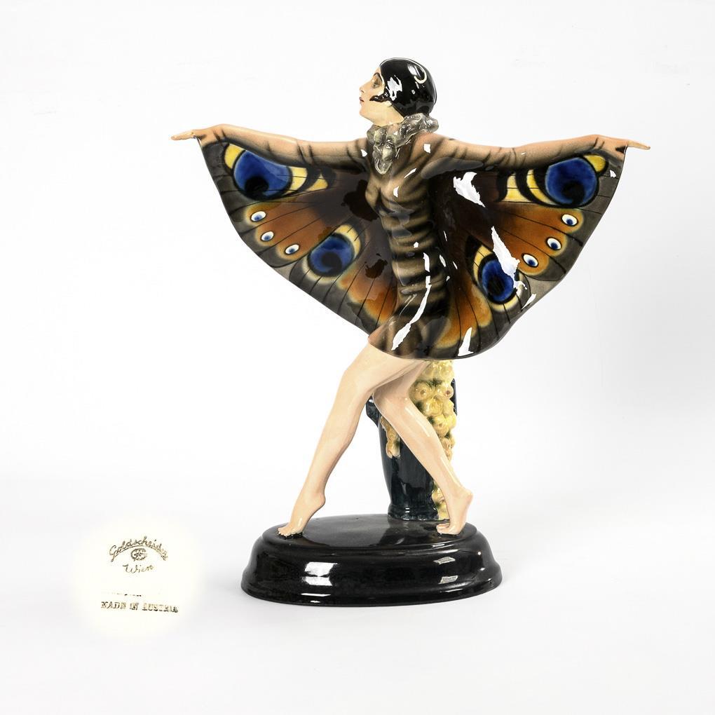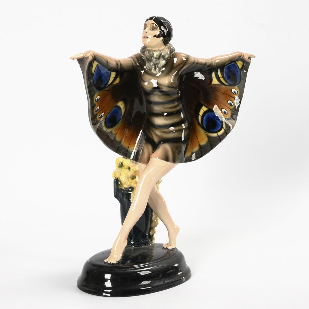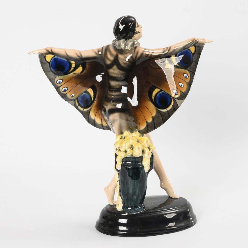 Art-déco-Figur beim faunalen Ausdruckstanz nach dem berühmten Vorbild der deutschen Tänzerin Niddy Impekoven (1904-2002), auf schwarzem Ovalsockel mit rosengefüllter Bodenvase. Oft auch als "Schmetterlingstänzerin" bezeichnet. 1 minimale Bestoßung an einer Blüte.