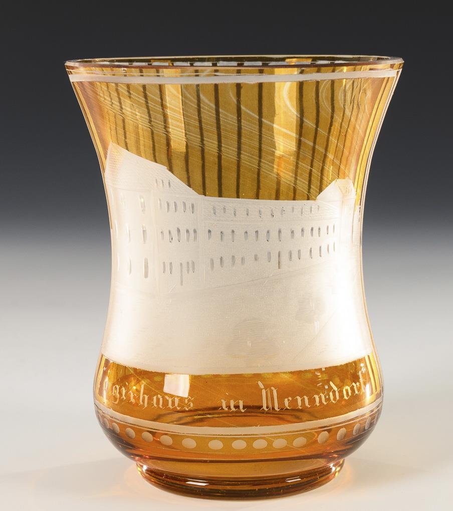 1 Kelchglas mit der Ansicht von Warmbrunn (H 14,5 cm). / 1 facettiertes Kelchglas mit Ansichten von Salzbrunn, Fürstenstein und Altwasser (H 11,5 cm). / 1 Becher mit einer Ansicht von Nenndorf (H 10 cm). 1x minimale Fußbestoßungen, 1x minimale Bestoßungen an den Schliffkanten.