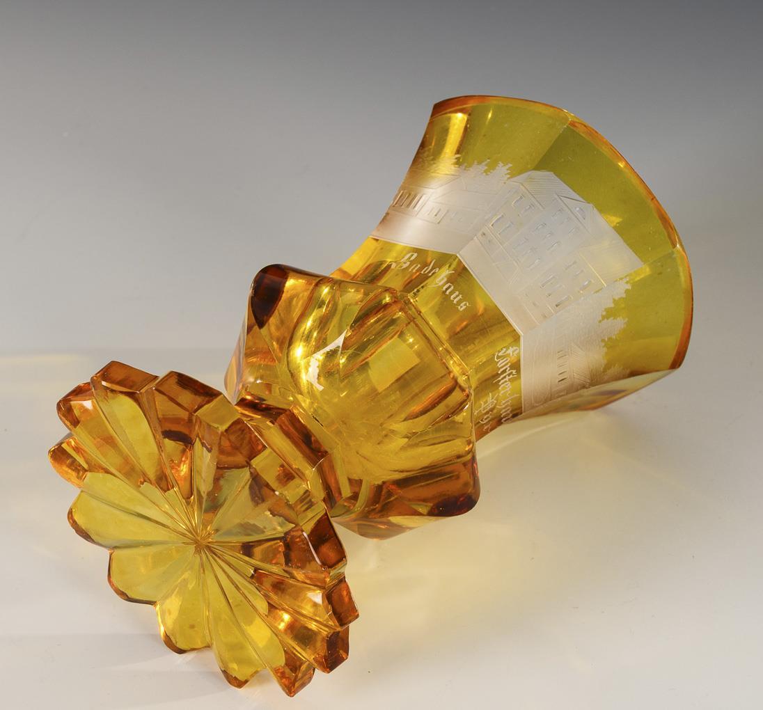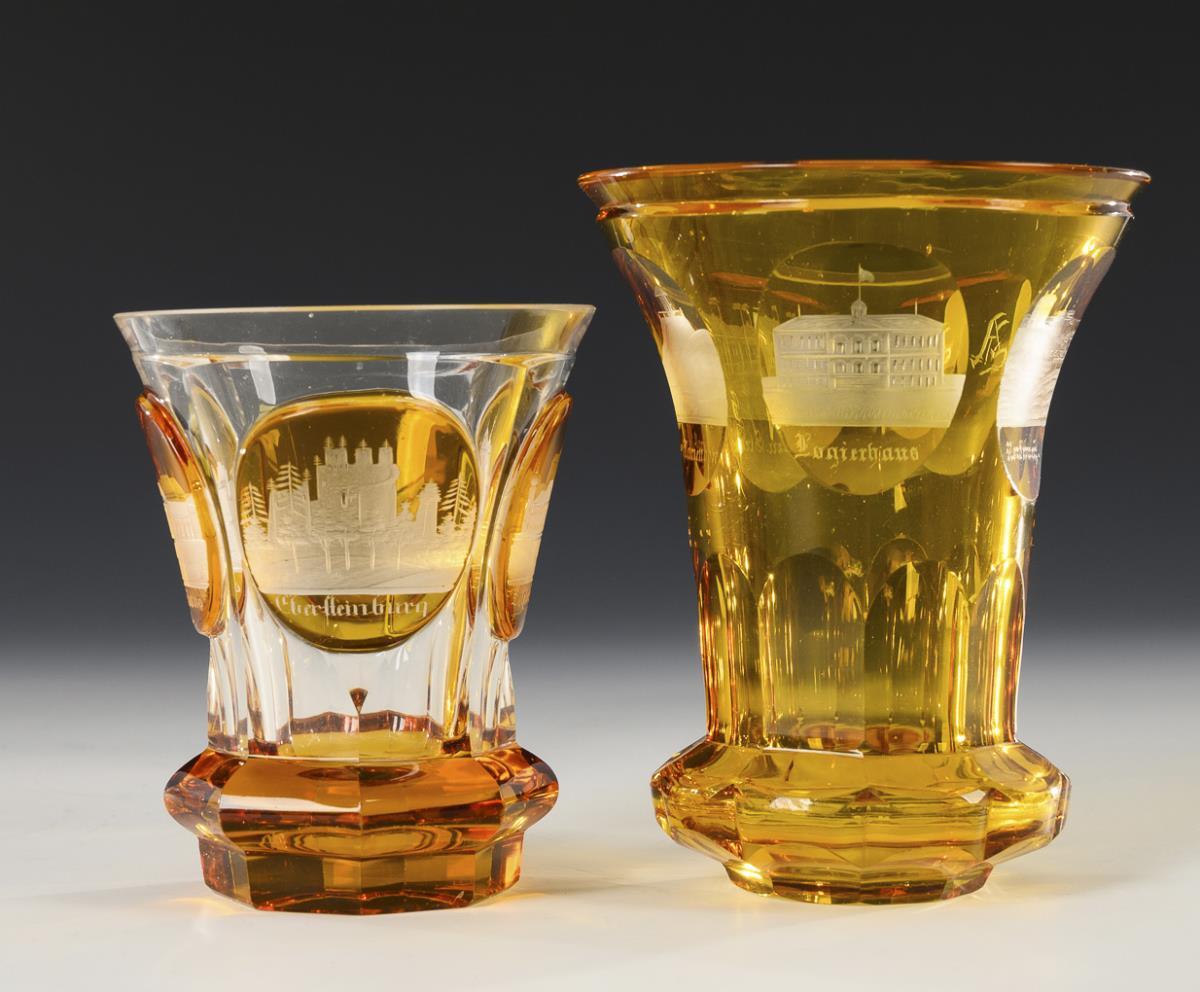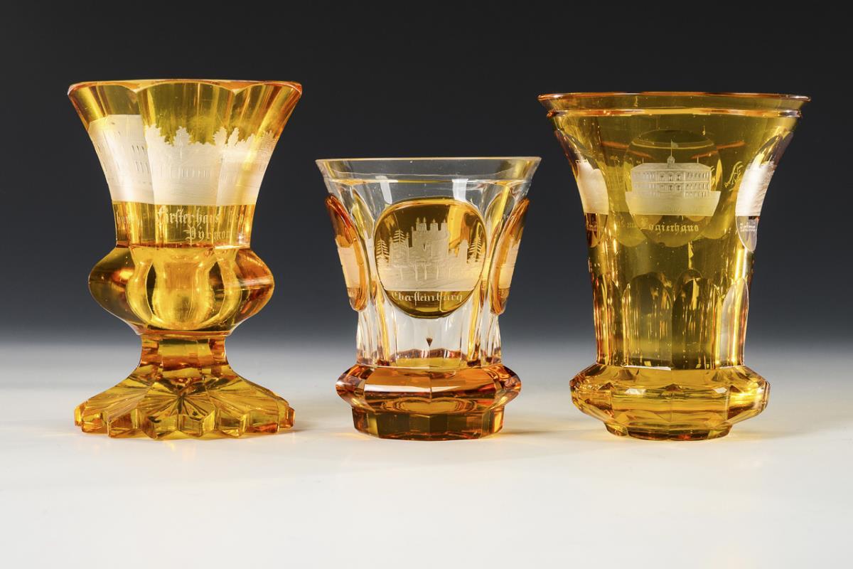 1 Kelchglas und 2 Ranftbecher, geschliffen und mit gravierten Ansichten (Baden, Bad Pyrmont, Norderney).
