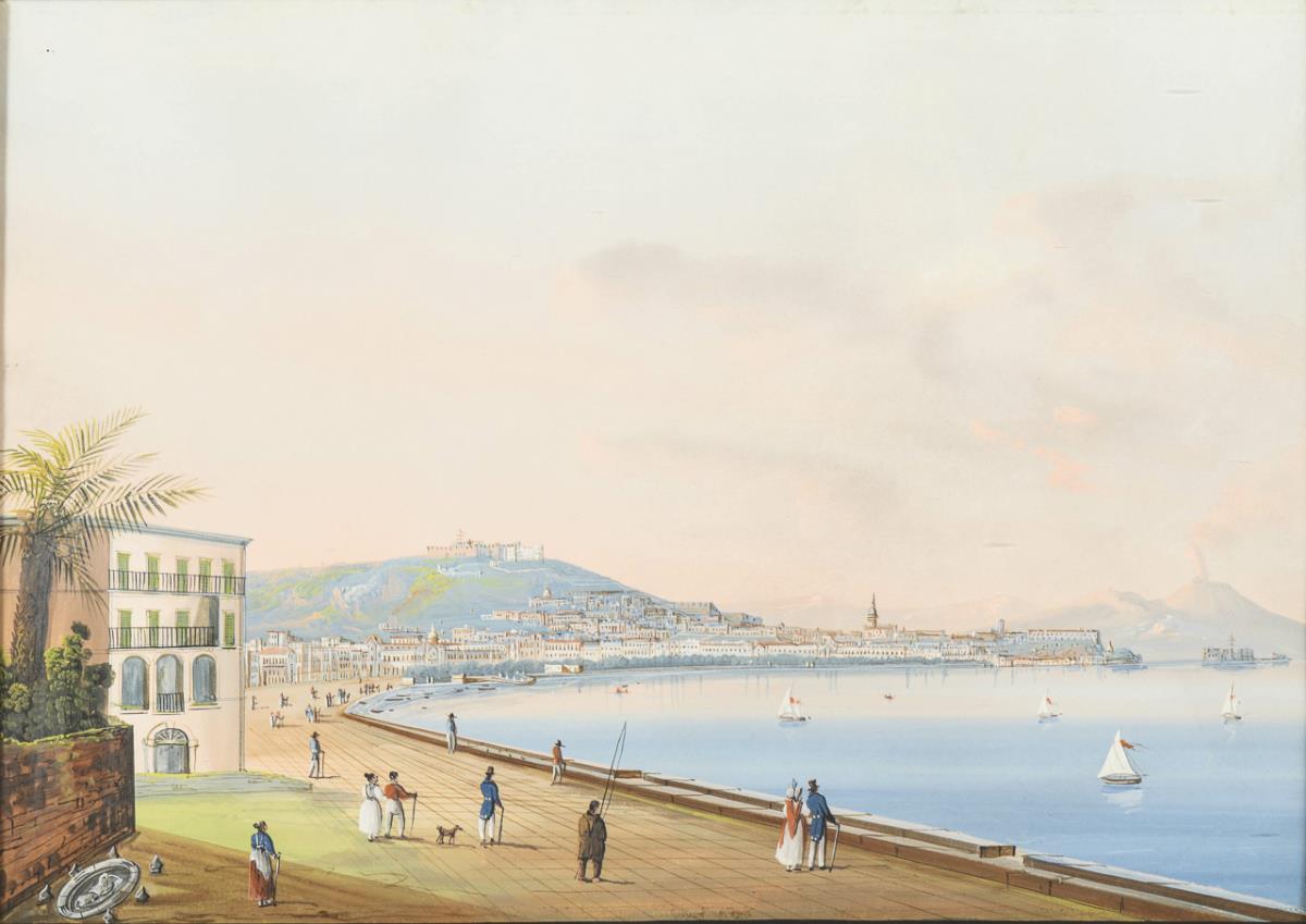 Mehrere Personen auf der breiten Promenade mit Blick in den Golf von Neapel zu den Schiffen.