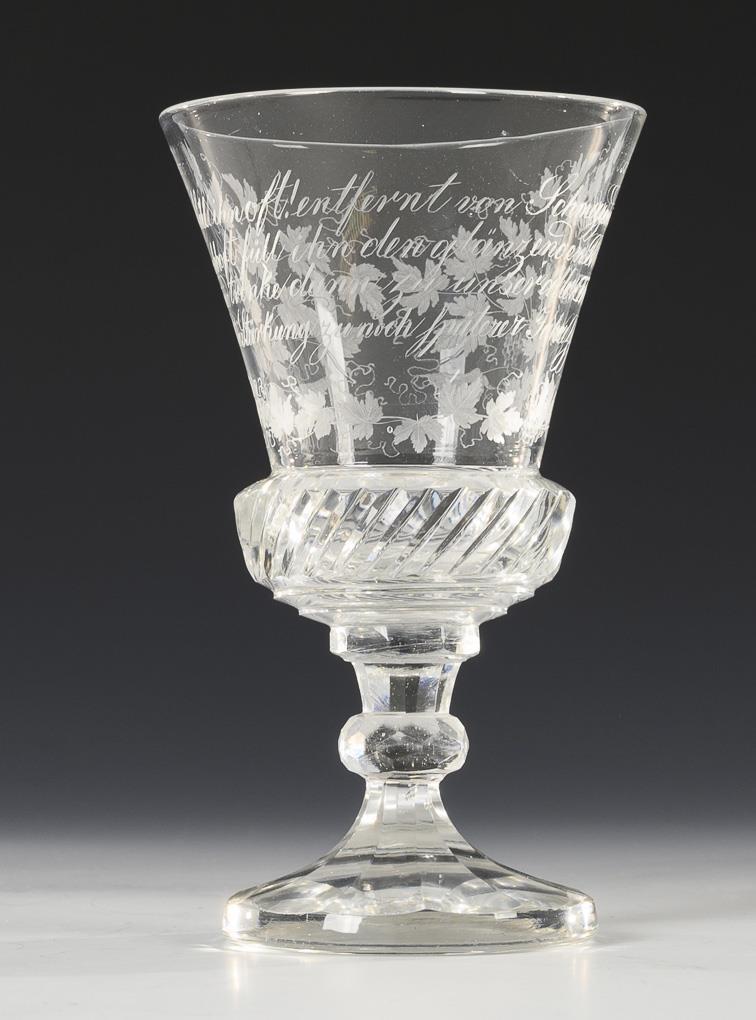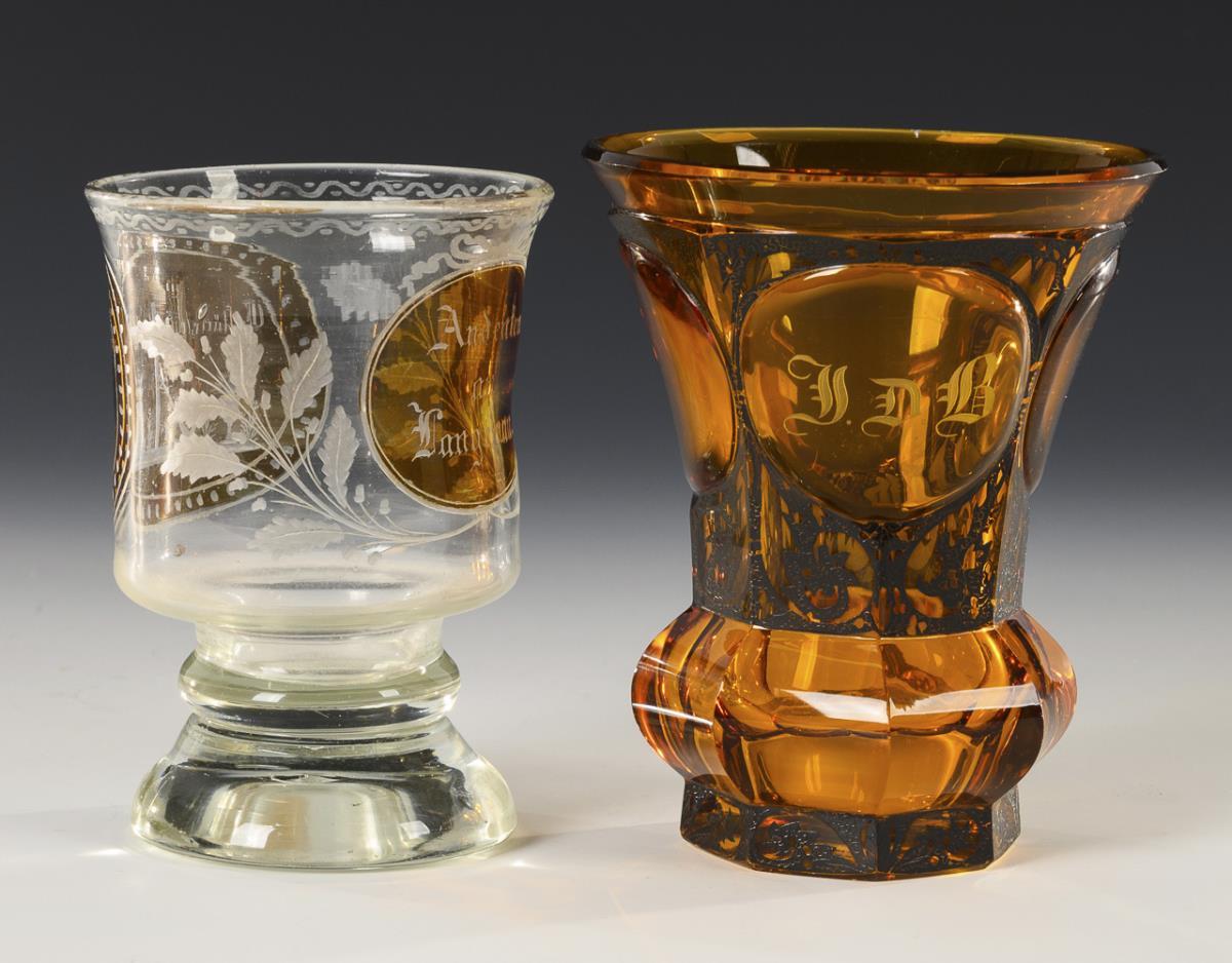 1x wohl Werkstatt Friedrich Egermann, Haida: Kraterbecher aus farblosem, bernsteinfarben gebeiztem Glas mit Facettenschliff und hochgeschliffenen Medaillons, Schwarzlotmalerei mit nadelradiertem Blattdekor, nadelradiertes Monogramm "F. D. B.". / 1x Glockenbecher aus farblosem, teils bernsteinfarben gebeiztem Glas mit gravierten Symbolen sowie der Aufschrift "Es tröste u. beglücke dich / Andenken an Langenau". / 1x Kelchglas mit Kerbschliffkranz am Kuppaansatz, facettiertem Schaft und Rundfuß; auf der Kuppa der von Weinreben umrankte, gravierte Spruch "O füll ihn oft! entfernt von Schmerz und Leide, noch oft füll ihn den glänzenden Pokal; und trinke dann zu unser aller Freude, Die Stärkung zu noch späterer Jahre Zahl". 1x Bestoßung am Fußrand und partiell an den Schliffkanten.