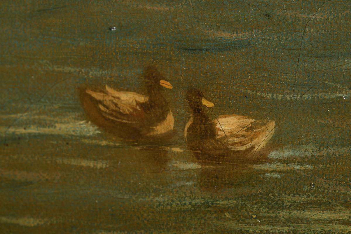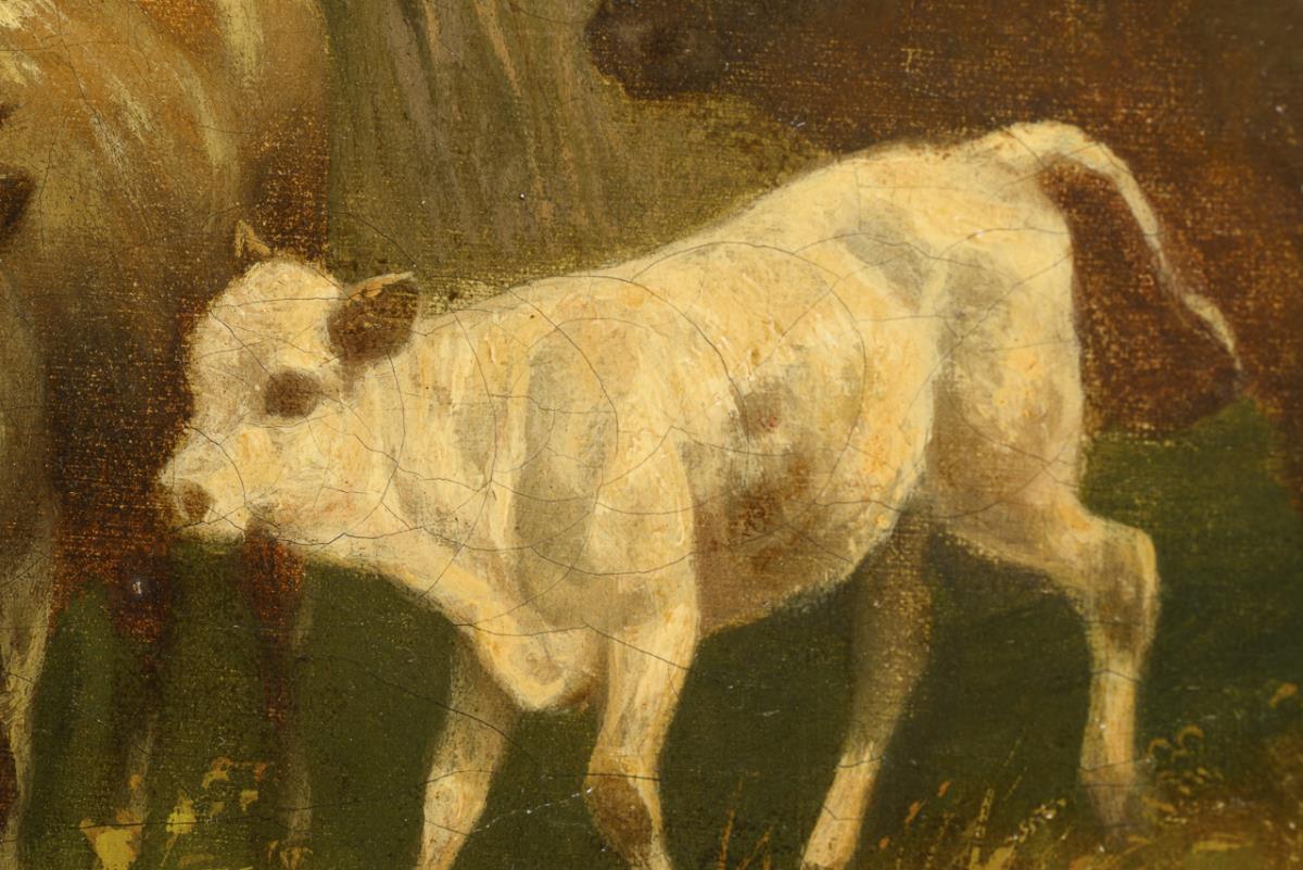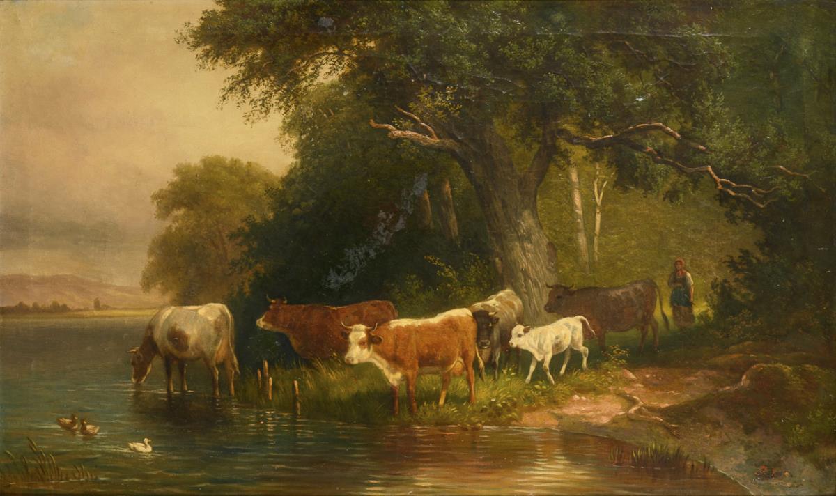Die Rinder an einem seichten Ufer dicht am Waldrand mit der weiter hinten folgenden Hirtin im milden Sonnenschein. Eine kleine restaurierte Stelle mit Hinterklebung, Altersspuren.