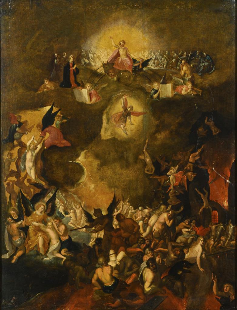 Vielfigurige Szene mit Jesus als Weltenrichter im Himmel, der das Gute vom Bösen scheidet. Altersspuren.