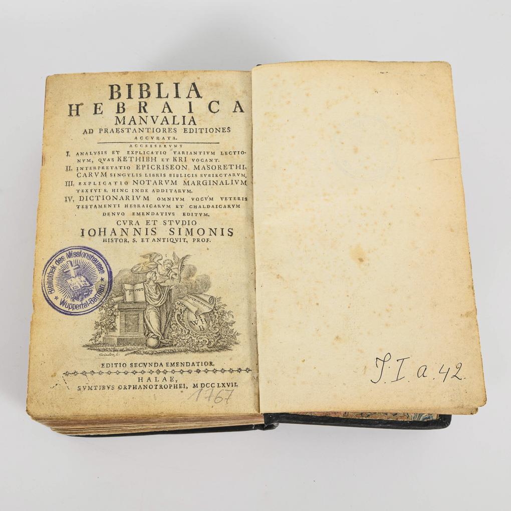 In Latein und Hebräisch. Cura et studio Johannis Simonis. Editio secunda emendatior. 16, 1334, 79, 75, 48 Seiten. Mit eingebunden: Johanne Simonis "Analysis et explicatio lectionum masorethicarum, Kethiban et Karjan" /Joahnne Simonis "Dictionarium veteris testamenti Hebraeo-Chaldaicum ..." / "Explicatio epicriseon masorethicarum ...". Ledereinband.